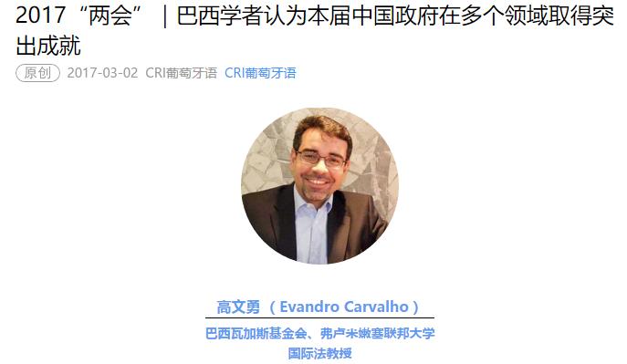 2017年“两会”召开前,365官网高端外专Evandro Menezes de Carvalho(中文名:高文勇)接受了国际在线(CRI Online)及新华网的专访。