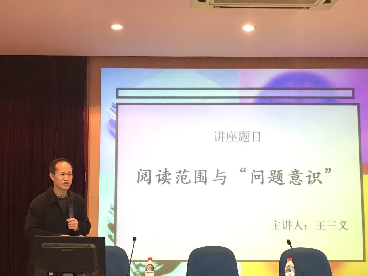 王三义教授结合自身的学习和职业生涯经历,从外国语学院研究生的择业面出发,对外语专业毕业生未来可从事的职业进行了探讨,并鼓励同学思考怎样过好研究生生活等一系列问题。随后,他从个人阅读旨趣与范围选择、获取资料的方式与效率、科研训练的小目标与大志向、“问题意识”的自然形成等方面与研究生同学共同探讨,并用简洁深刻的语言表达了自己对上述问题的看法。他认为,研究生应当从技术层面入手完成规定的任务,写论文时要善于发现问题,学会利用对比检视法来判断什么样的文章才是好文章。