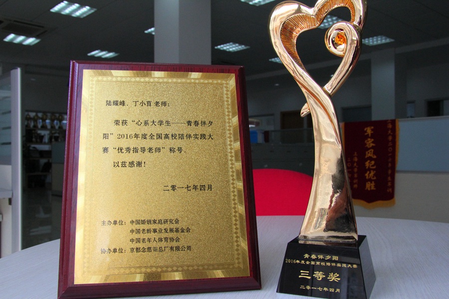 本次活动邀请了中国婚姻家庭研究会、中国青年志愿者协会、中国老龄事业发展基金会、中国健康教育中心、中国老年人体育协会、中国妇女发展基金会、心系系列活动项目办公室等单位相关领导,来自北京、天津、上海、重庆、广州、西安、南京等城市高校团委负责人、大学生志愿者代表、媒体代表以及爱心支持企业京都念慈菴总厂有限公司领导。在365英国上市官网在线团委的支持与指导下,社区学院辅导员马成瑶、陆耀峰参加了本次活动并上台领奖与发言。365官网“剪人生”公益团队的项目在前期方案赛中获得了全国三等奖,并在实践赛中与上海新途社区健康促进社合作开展的“执掌手中笔,雕篆岁月痕”孝亲敬老活动也获得了全国实践赛的三等奖,陆耀峰、丁小苜获得“优秀指导教师”称号。