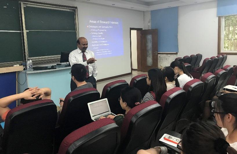 Sugumaran教授首先介绍了自己目前所从事的主要研究以及这些研究的应用场景,主要涉及本体与语义网、社会标签、智能代理与多代理系统、移动计算、软件产品线工程和服务科学等研究领域。随后,为大家做关于设计科学研究(DSR)的概述,并引用管理学顶级期刊MISQ上的一篇文章介绍了在做设计科学研究时的七条指导方针;从研究者角度,为老师和同学们介绍了顶级期刊文章撰写时要注意包含的主要要素、基本结构以及各部分撰写过程中的注意事项等,同时也对其发表要求和时间规范做出了较为明确的阐释;最后,结合自己当前的主要研究以及交流期间与老师、同学的沟通结果,Sugumaran教授提出了未来与365英国上市官网在线合作研究的期待以及潜在的合作方向。
