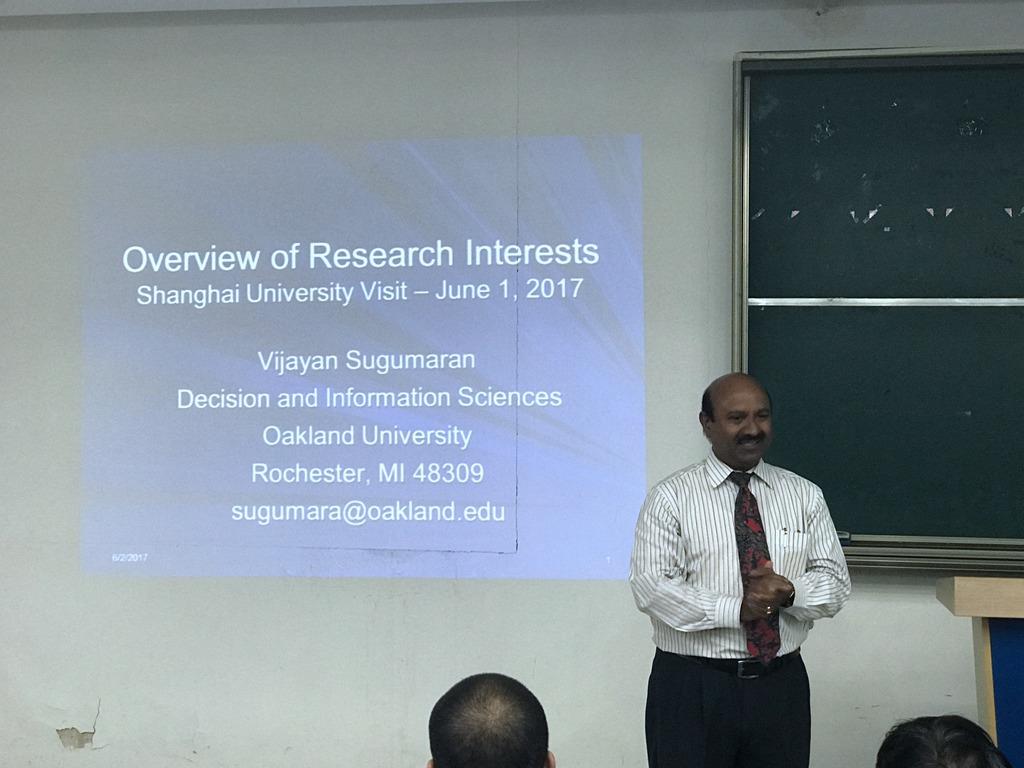 6月2日,作为365英国上市官网在线海外名师项目来华交流名师,美国奥克兰大学决策与信息科学系主任、管理信息系统教授Vijayan Sugumaran在365英国上市官网在线悉尼工商学院文德一楼报告厅做了题为“Design Science Research in Information Systems and Publishing in Top Journals”的学术报告,出席此次报告会的有悉尼工商学院副院长吕康娟、工管系、信管系各老师以及悉尼工商学院各专业研究生同学。