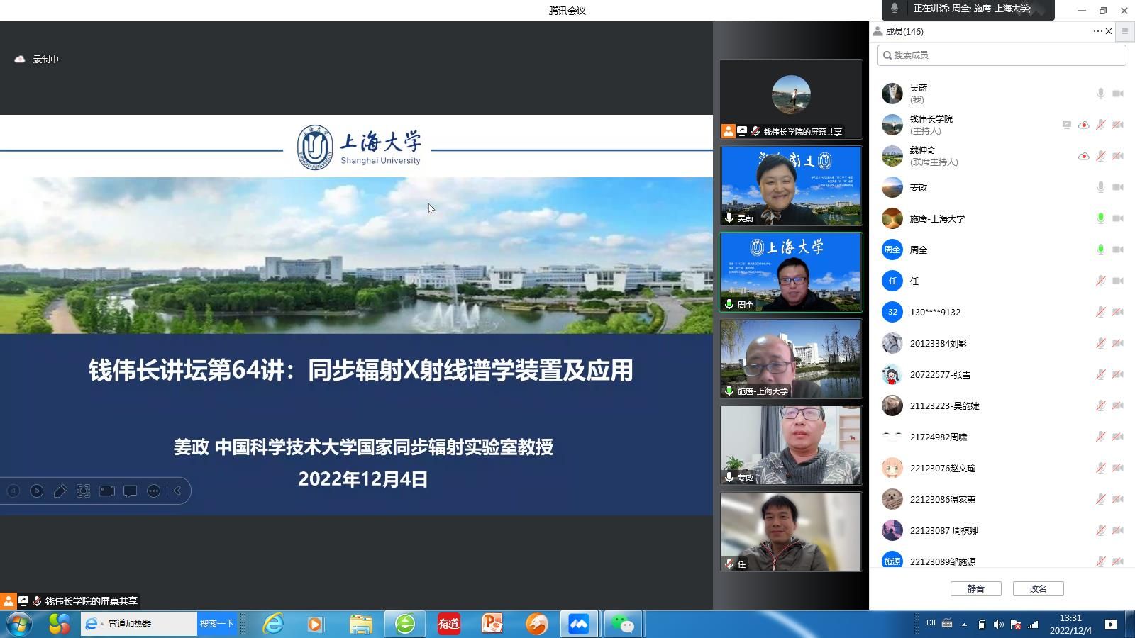 12月4日下午,钱伟长讲坛第64讲《同步辐射X射线谱学装置及应用》于线上顺利举行。本次讲坛有幸邀请到中国科学技术大学国家同步辐射实验室姜政教授担任主讲。校学术委员会秘书处秘书长施鹰,钱伟长学院党委书记吴蔚,党委副书记、院长周全,党委副书记、副院长沈青松,副院长任伟以及学院师生共同聆听了讲座。此次讲座还通过线上腾讯会议和蔻享直播的方式吸引了校内外专家学者、师生等1600余人在线观看。讲座由钱伟长学院周全院长主持。