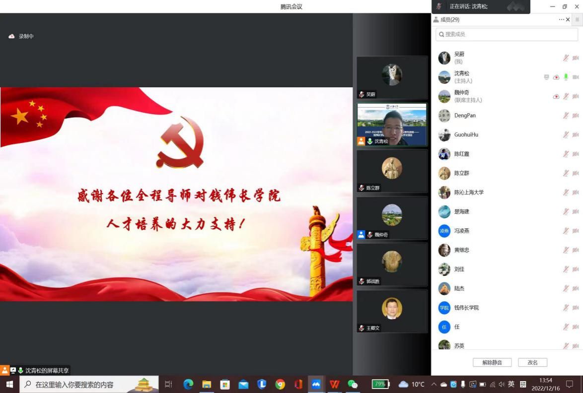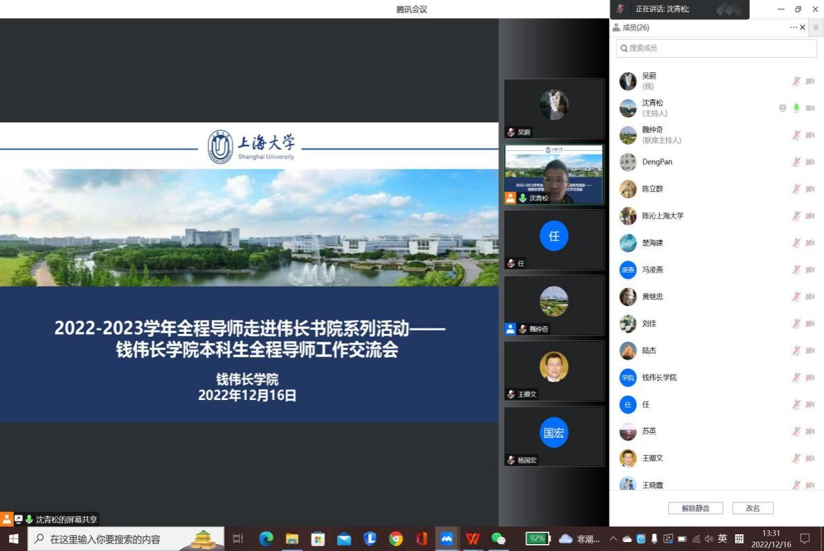 12月16日下午,为进一步推进钱伟长学院本科生全程导师制工作,钱伟长学院通过腾讯会议线上召开2022-2023学年全程导师走进伟长书院系列活动——钱伟长学院本科生全程导师工作交流会议,会议邀请钱伟长学院全体2022级全程导师参加座谈交流。钱伟长学院党委书记吴蔚,钱伟长学院党委副书记、院长周全,党委副书记、副院长沈青松,副院长许新建、任伟等学院老师参加了交流会。会议由沈青松老师主持。