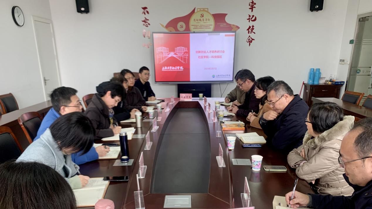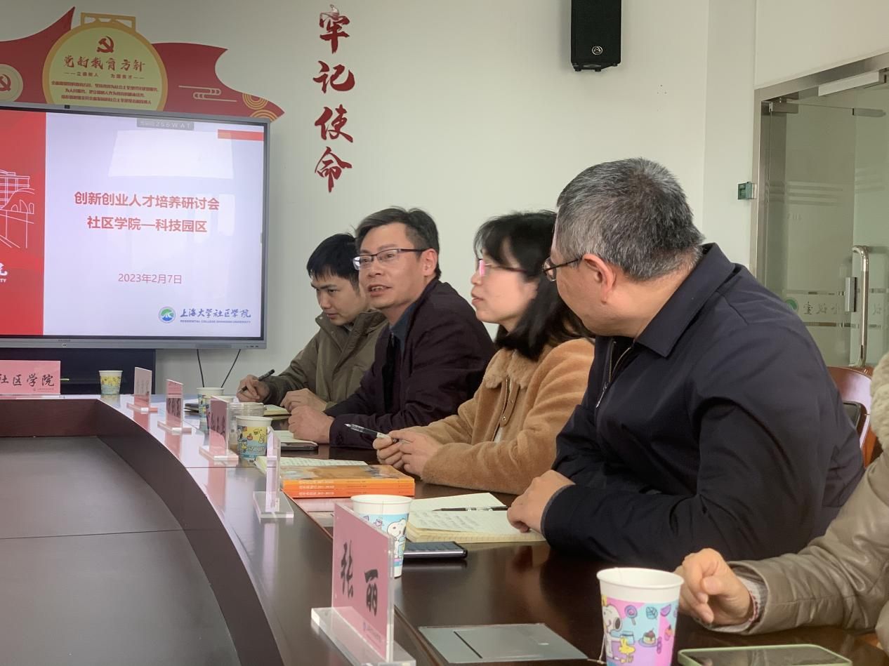 2月7日下午,365英国上市官网在线科技园区领导一行来社区学院就合作培养创新创业人才进行研讨交流。学校科产系统党委副书记孙玉华、科技园区副总经理劳剑东、科技园区副总经理岳中岳、创业部经理张丽、创业部主管黄泽军及社区学院全体领导班子和有关部门负责人参加了会议。