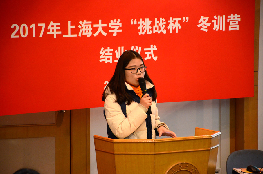 随后,材料学院15级研究生窦维维和社会学院13级本科生廖香园分别代表自然科学类和哲学社会科学类冬训营营员发言。他们对老师们牺牲假期时间,为同学们组织策划这场3+X+4模式的冬训营活动表示衷心感谢。同时,他们认为冬训营是为每个项目团队参加“挑战杯”做的最有意义和最有质量的准备,收获的不仅是交到了很多朋友,学习了很多的创新思维,更是那种不惧困难的挑战精神和勤奋严谨的求学态度,这些无形的财富无论对自己以后的学习还是工作,都有很大的帮助。他们表示:“雄关漫道真如铁,而今迈步从头越。”自己将继续努力,更加坚定的在挑战之路上奋勇向前。