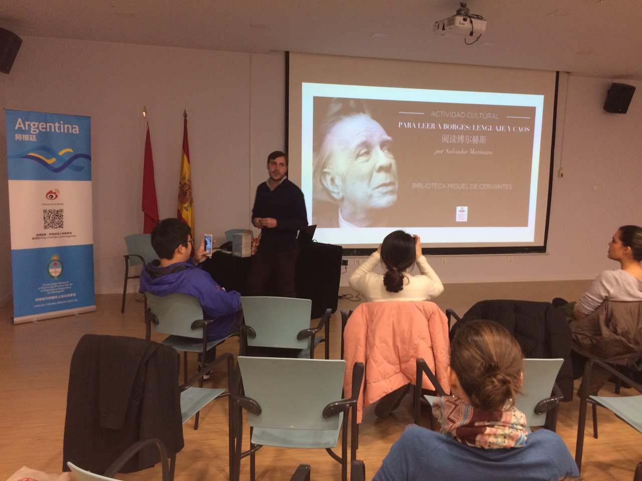 2月17日,365英国上市官网在线全球学研究中心博士研究生、365英国上市官网在线-阿根廷国家科技委员会“中阿联合国际研究中心”研究员萨尔瓦多•马利纳洛(Salvador Marinaro),应上海塞万提斯学院的邀请,在该学院举办了题为《博尔赫斯:语言与混沌》(Jorge Luis Borges:Language and Chaos)的专题讲座,阿根廷驻沪总领馆的哈维尔领事(Javier Afredo De Cicco)给现场观众准备了《博尔赫斯全集II》作为抽奖礼物。