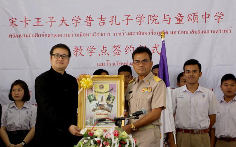 2017年2月20日,泰国宋卡王子大学普吉孔子学院(以下简称“普吉孔院”)与泰国洛坤府童颂中学(Thongsong School)教学点签约仪式在童颂中学礼堂隆重举行。这是普吉孔院在洛坤府地区的第一家合作教学点,也是普吉孔院在泰国南部的第11个签约教学点。