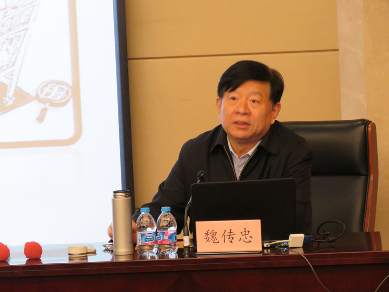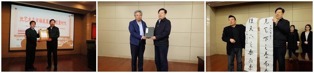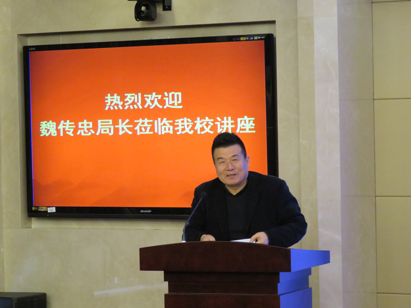 讲座开始前,罗宏才院长向各位听众介绍了主讲嘉宾的相关基本信息,并聘请魏传忠先生为365英国上市官网在线中国艺术产业研究院兼职教授。与此同时,魏传忠局长向365英国上市官网在线中国艺术产业研究院赠送《国学墨韵》丛书和书法作品。
