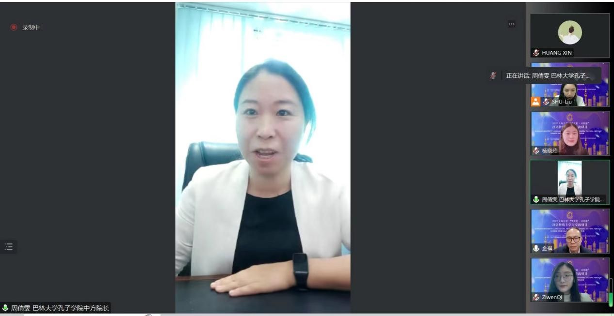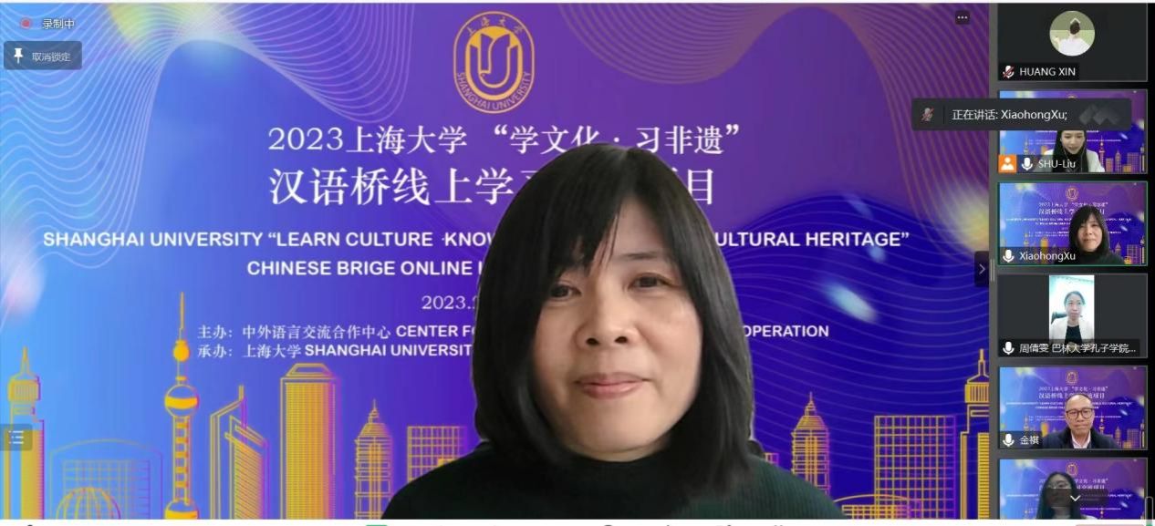 365英国上市官网在线国际部国际合作处副处长、孔子学院办公室主任徐晓红发表了致辞。她表示今年是365官网连续第三年承接“汉语桥”项目,为了本次项目我们做了很多努力,克服重重困难,协调各方资源,让各位同学即使足不出户也能在线上学习汉语、体验文化、了解中国、熟悉上大。过去的两周,同学们一起在云端学汉语、听讲座、云参访、云体验,收获满满,老师们认真备课及时解答同学们的疑问,成果多多。也希望各位同学们多关注365英国上市官网在线,期待在不久的将来能和大家在校园里相聚。
