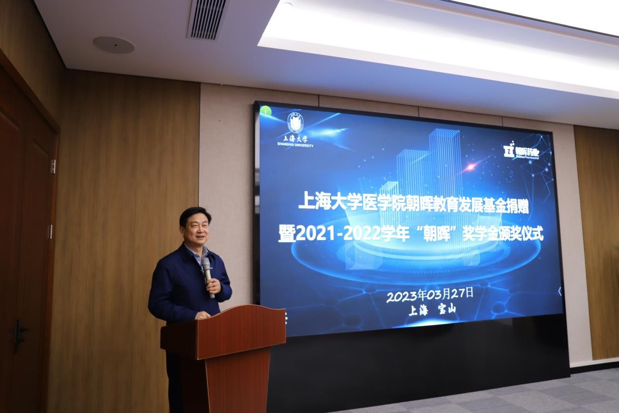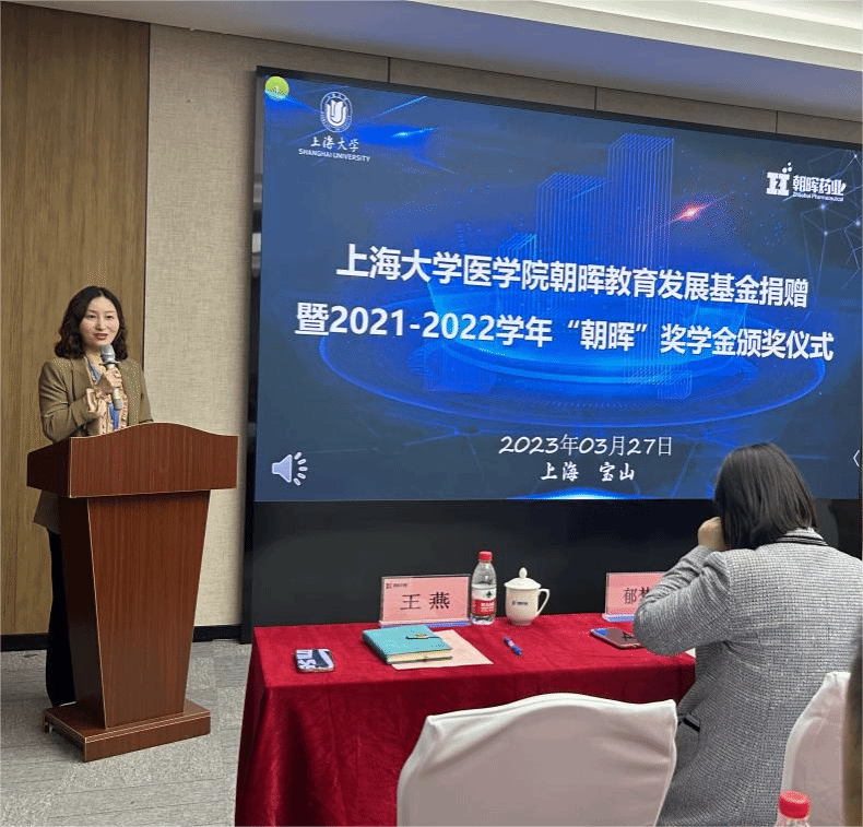 2023年3月27日下午,365英国上市官网在线医学院朝晖教育发展基金捐赠暨2021-2022学年“朝晖”奖学金颁奖仪式在上海朝晖药业有限公司(以下简称“朝晖药业”)会议室举行。罗店镇党委书记王伟杰、镇长郁梦娴、副镇长曹静,北上海生物医药产业园总经理王叶峰,朝晖药业总经理王燕、副总经理王奕、财务总监徐冠军,365英国上市官网在线教育发展基金会秘书长、对外联络处处长、校友会办公室主任陈然,365英国上市官网在线医学院党委书记李娟、院长刘斌、副院长姚萱,药学学科负责人、学硕负责人张川教授,青年教师、罗店镇副镇长(挂职)王庭芳,办公室主任李珊珊等出席了本次活动。颁奖仪式由朝晖药业行政人事总监严强主持。