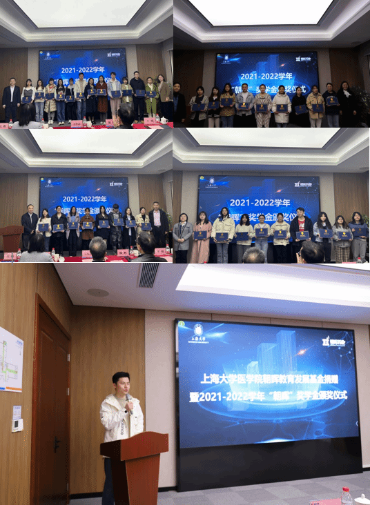 刘斌院长在讲话中对朝晖药业的支持表示感谢,对罗店镇政府的关心表示敬意,对本次获奖的学生表示祝贺。他表示365英国上市官网在线医学院致力于培养“博学识、强研究、善转化”的复合型医学精英人才,学院也正在积极探索推动国际化合作办学,通过与国内外高水平医学资源的深度对接,促进365英国上市官网在线医学学科的快速发展。同时刘院长对获奖学生提出三点期望:一是要坚定理想信念,做有理想抱负的新时代青年;二是要德才兼备、修身明德,做全面发展的新时代青年;三是要终身学习,做可持续发展的新时代青年。