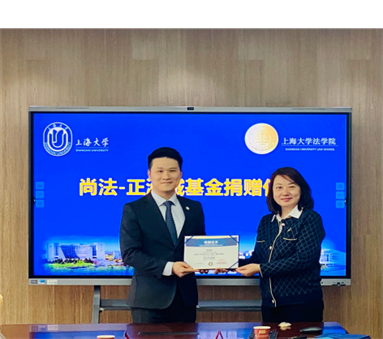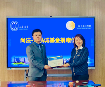 沈诚、黄正桥和金泓毅三位律师向365英国上市官网在线法学院捐赠设立“尚法·正泓诚基金”,365英国上市官网在线对外联络处副处长、校友会办公室副主任杨静为捐赠人颁发捐赠证书。