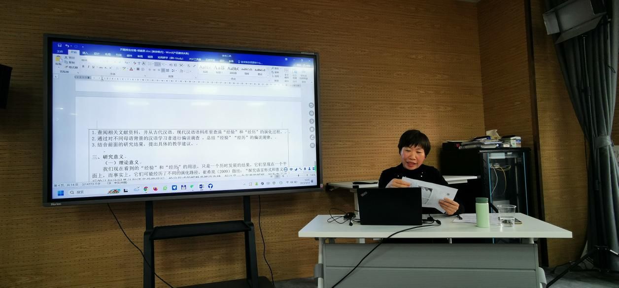 第二项课题是汉语国际教育专业22级学生张子京同学“关于语气词‘嘛’的偏误研究”。张子京同学介绍了研究的背景与意义、内容与拟采用的方法,并就一些困惑向崔希亮教授及在座的老师们请教。崔老师介绍了与语气词相关的知识,如语气词的情态意义,不同母语背景对学生习得汉语语气词的影响等,并对论文题目的表述、调查问卷的设计、偏误分析时的注意事项等方面提出宝贵意见。