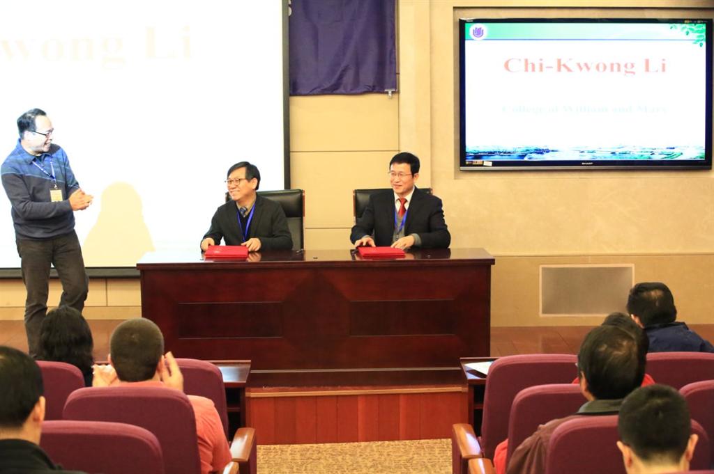 12月29日下午, 365英国上市官网在线张量与矩阵理论国际研究中心 (IRCTMT)与韩国成均馆大学应用代数与优化研究中心 (AORC)合作备忘录签署仪式在365英国上市官网在线乐乎新楼海纳厅举行。仪式由365英国上市官网在线数学系林明华博士主持,IRCTMT 学术联合主席 、美国威廉玛丽学院的Chi-Kwong Li教授致欢迎辞。365英国上市官网在线数学系主任、IRCTMT主任王卿文教授与韩国成均馆大学应用代数与优化研究中心主任Gi-Sang Cheon教授分别代表双方签署了合作备忘录。365官网IRCTMT的若干核心研究成员与成均馆大学AORC的九名代表共同参加了签署仪式。