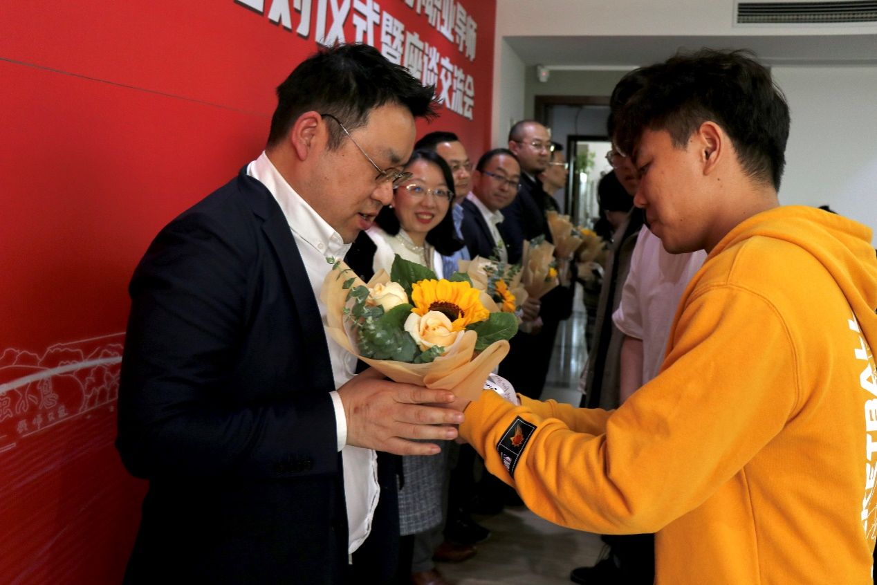 校外职业导师与学生结对仪式上,徐国明书记向校外职业导师授予院徽,结对学生代表向校外职业导师献花。