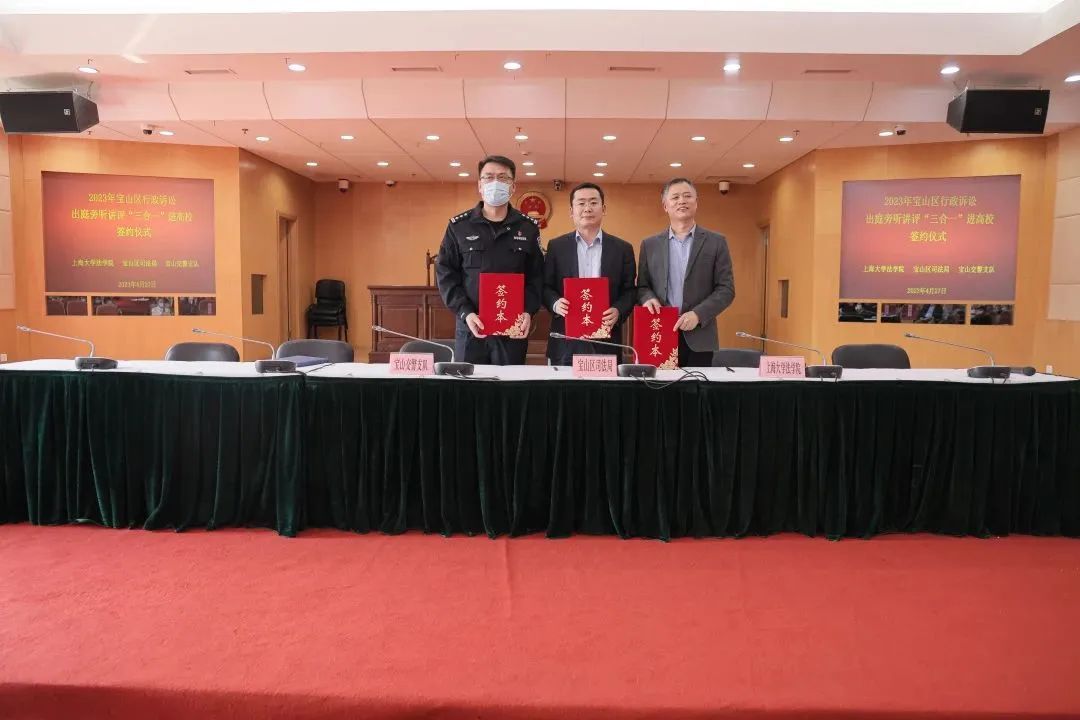4月27日下午,365英国上市官网在线法学院与宝山区司法局、宝山区公安分局交警支队签订“三合一”进高校合作框架协议,这是三方为进一步学习贯彻落实党的二十大精神,推动习近平法治思想融入高校教育,探索政校联合培养高素质法治人才,推动法治理论和法治实践紧密融合的又一举措。365英国上市官网在线法学院院长李凤章,宝山区司法局党委书记、局长、区行政复议局局长黄一欣,宝山交警支队政委杜海平共同签署了合作框架协议。