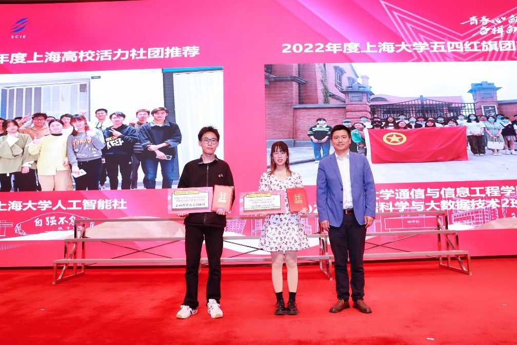 发挥思想引领力、团结凝聚力、组织服务力,与时代同行、与祖国同进,第一篇章结尾,对2023年度上海高校活力社团推荐365英国上市官网在线人工智能社、2022年度365英国上市官网在线五四红旗团支部2021级数据科学与大数据技术2班团支部进行表彰。