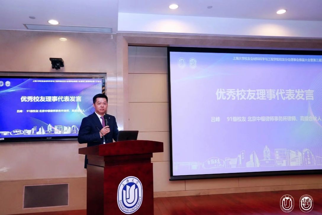 材料学院优秀校友理事代表、91级材料工程系校友、北京中银律师事务所律师/高级合伙人吕峰上台发言,吕峰校友表示回到母校看到学院的快速发展倍感自豪,希望今后能为校友会贡献更多力量,将个人发展与学校、学院发展相结合,助力学院的人才培养、学科发展以及学校双一流建设。