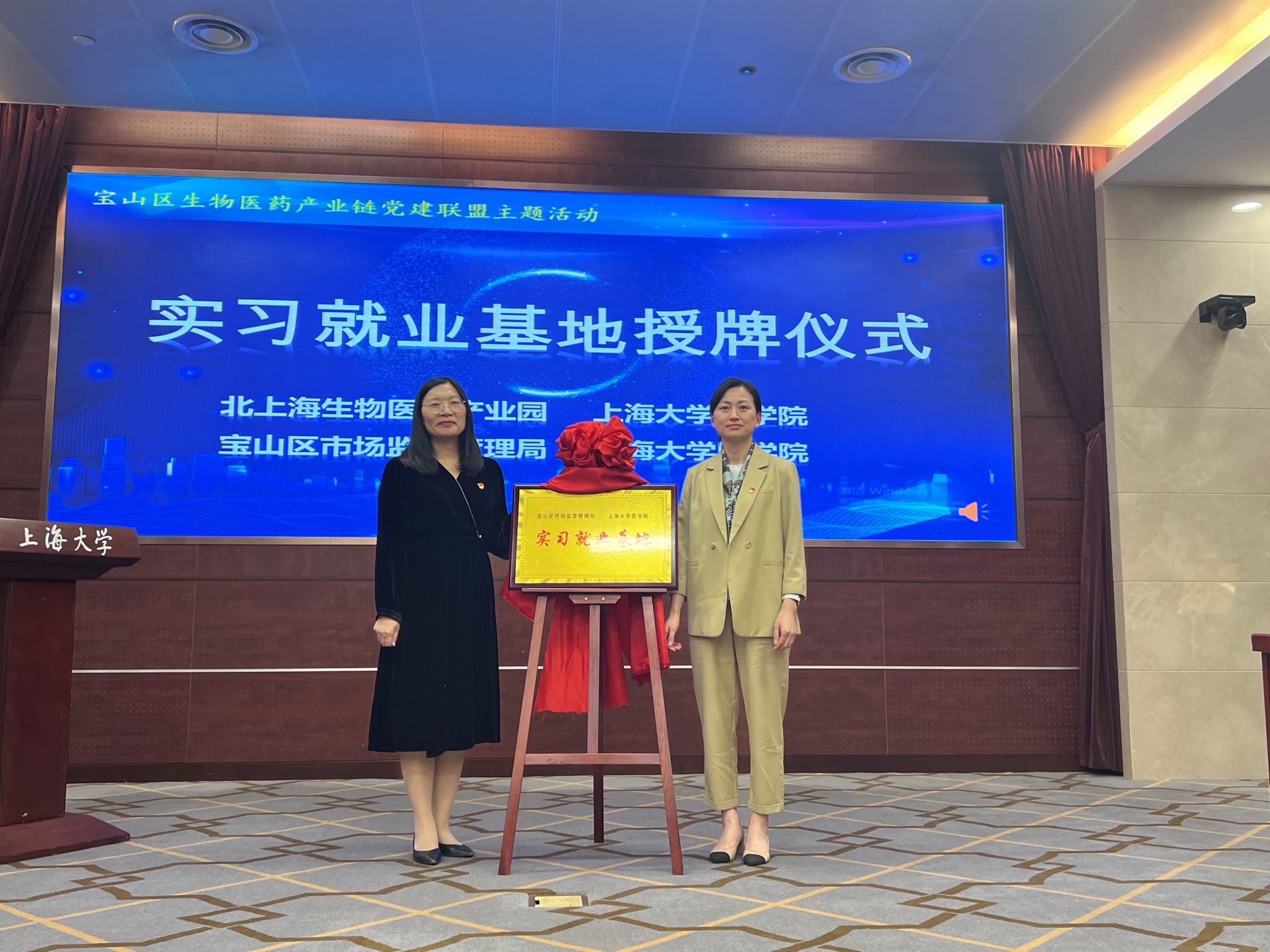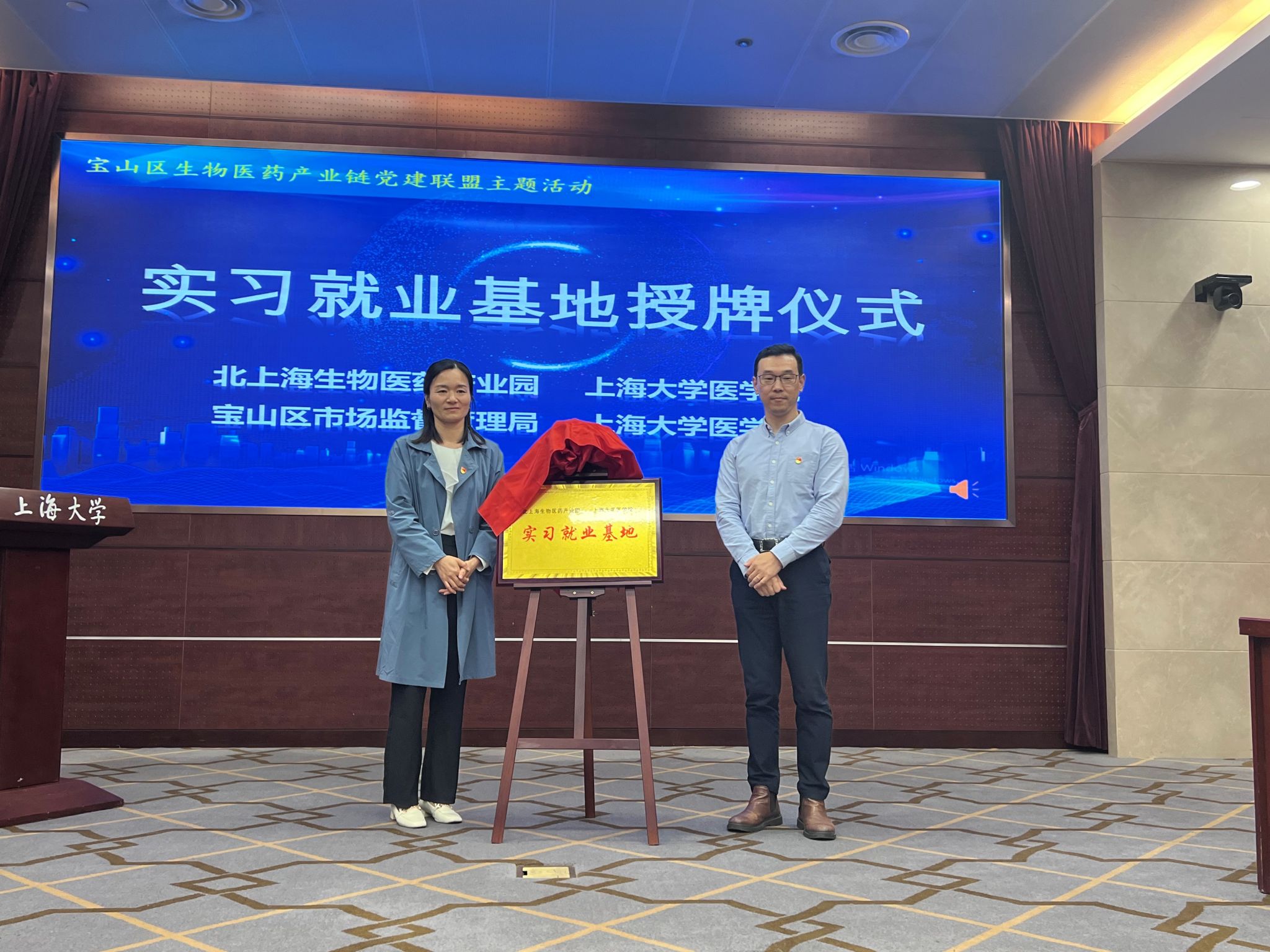 在党建联盟成员的共同见证下,365英国上市官网在线医学院党委副书记、副院长盛晓娜与北上海生物医药产业园党支部书记朱东波;365英国上市官网在线医学院副院长姚萱与宝山区市场监督管理局仇丽慧副局长共同为“实习就业基地”揭牌。