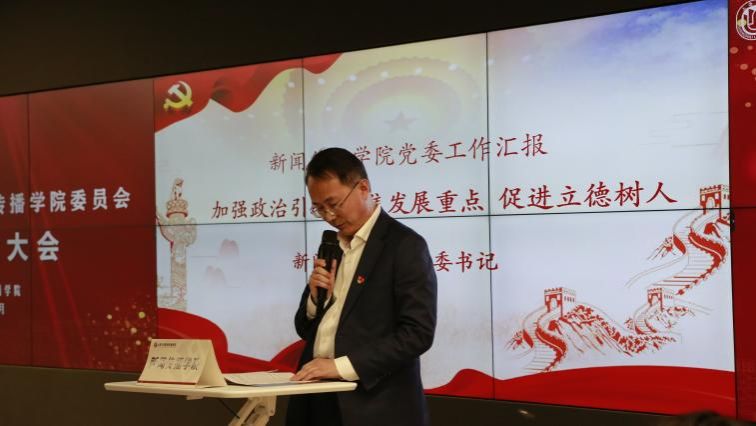 学院党委书记王晴川作了题为《加强政治引领,聚焦发展重点,促进立德树人》的工作报告。报告总结了在学校党委的正确领导下,五年来,新闻传播学院党委坚持以习近平新时代中国特色社会主义思想为指导,在“加强党的全面领导,加强政治思想引领,深入学习贯彻党的二十大精神;夯实基层党建工作,建设坚强战斗堡垒;严明政治纪律和政治规矩,认真履行管党治党主体责任;坚持“两手抓”和“两手硬”,党建工作与中心工作融合发展;严密筑牢疫情防线,守护师生健康安全”等五个方面取得的丰硕建设成果。在总结成绩和经验的基础上,报告指出,在今后的工作中,我们将以政治建设为根本,以组织建设为保证,以“三会一课”为抓手,以立德树人为目标,以文化育人为特色,以严明纪律为底色,狠抓全面从严治党,进一步夯实基层党建工作。