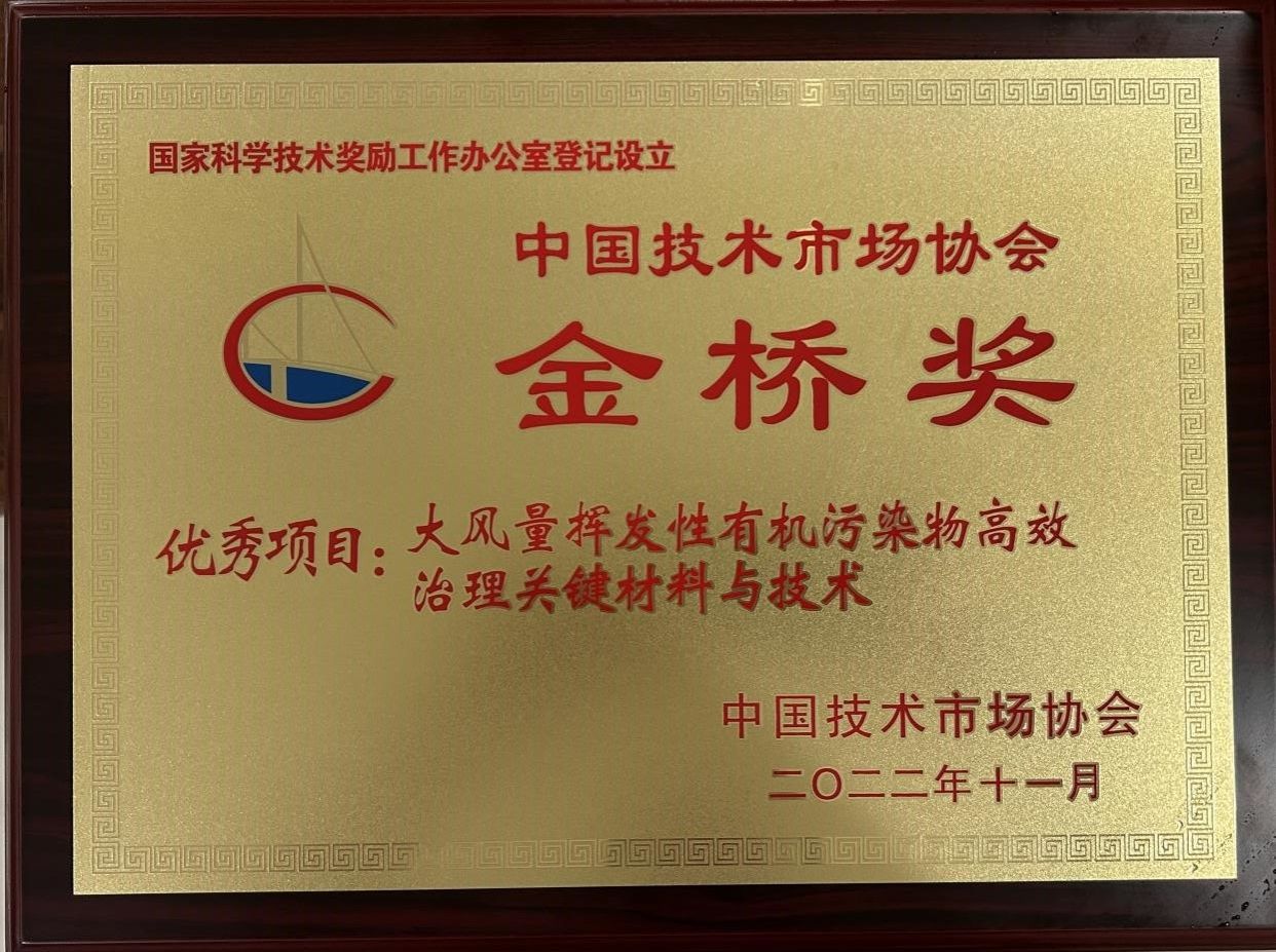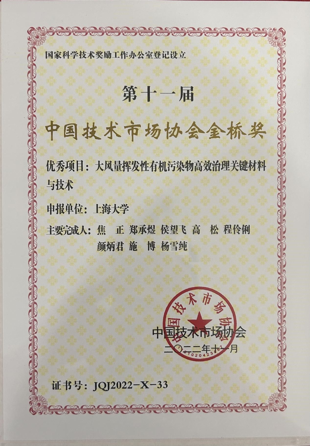 为全面贯彻党的二十大会议精神和习近平新时代中国特色社会主义思想,深入落实党中央、国务院关于科技工作的决策部署,进一步推动科技成果转移转化和高新技术产业化,促进技术市场高质量发展,第十一届中国技术市场协会金桥奖表彰奖励大会于2023年6月10日在北京召开。环境与化学工程学院焦正团队“大风量挥发性有机污染物高效治理关键材料与技术”荣获中国技术市场协会金桥奖。该奖项是经国家科学技术奖励办公室审定、批准设立的全国技术市场的最高奖项。该奖项主要奖励技术创新性突出、经济和社会效益显著、推动行业科技进步,为实体经济发展做出突出贡献的优秀项目。
