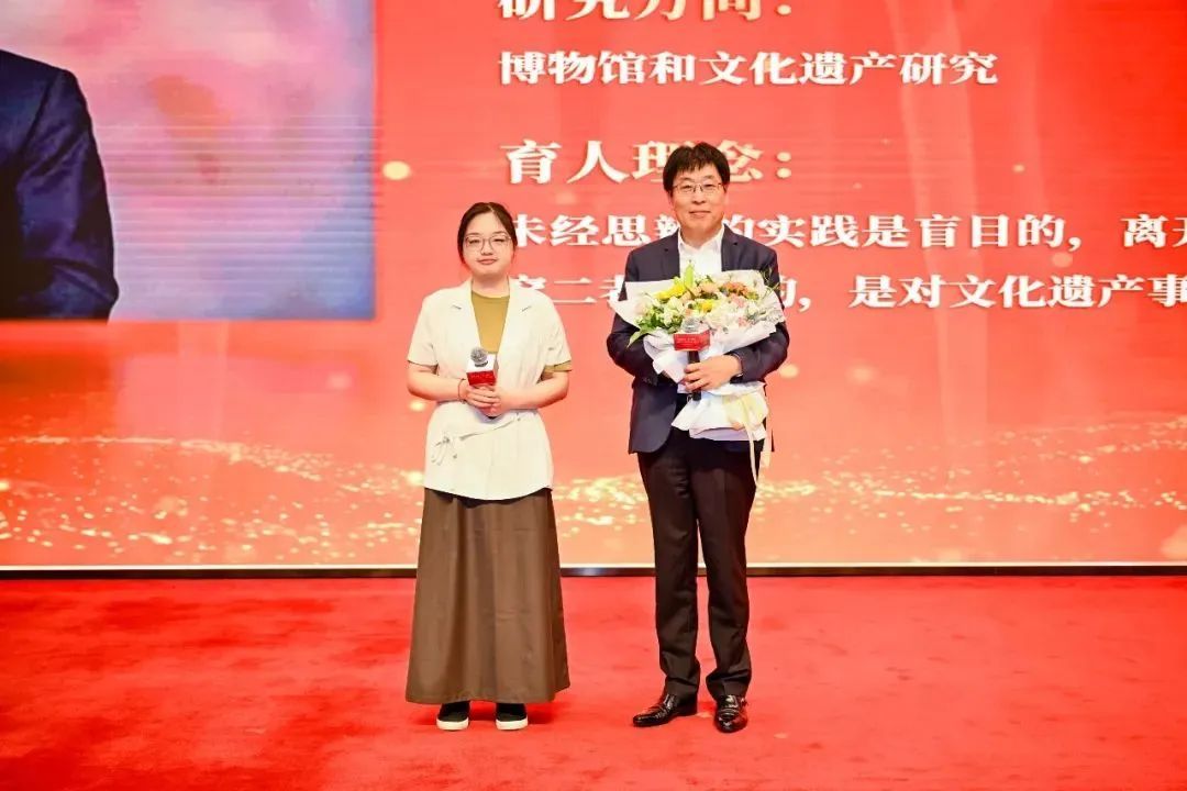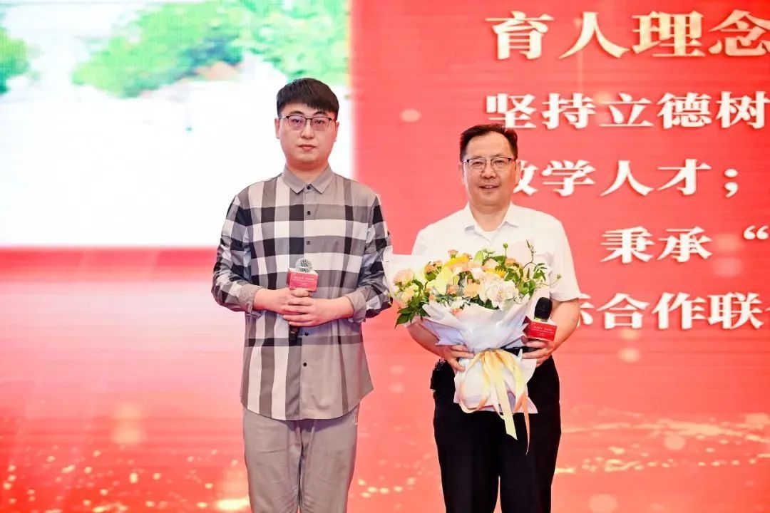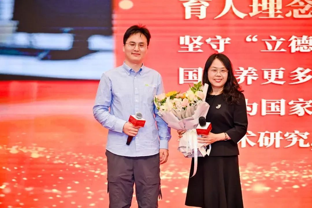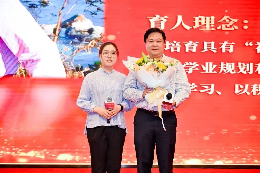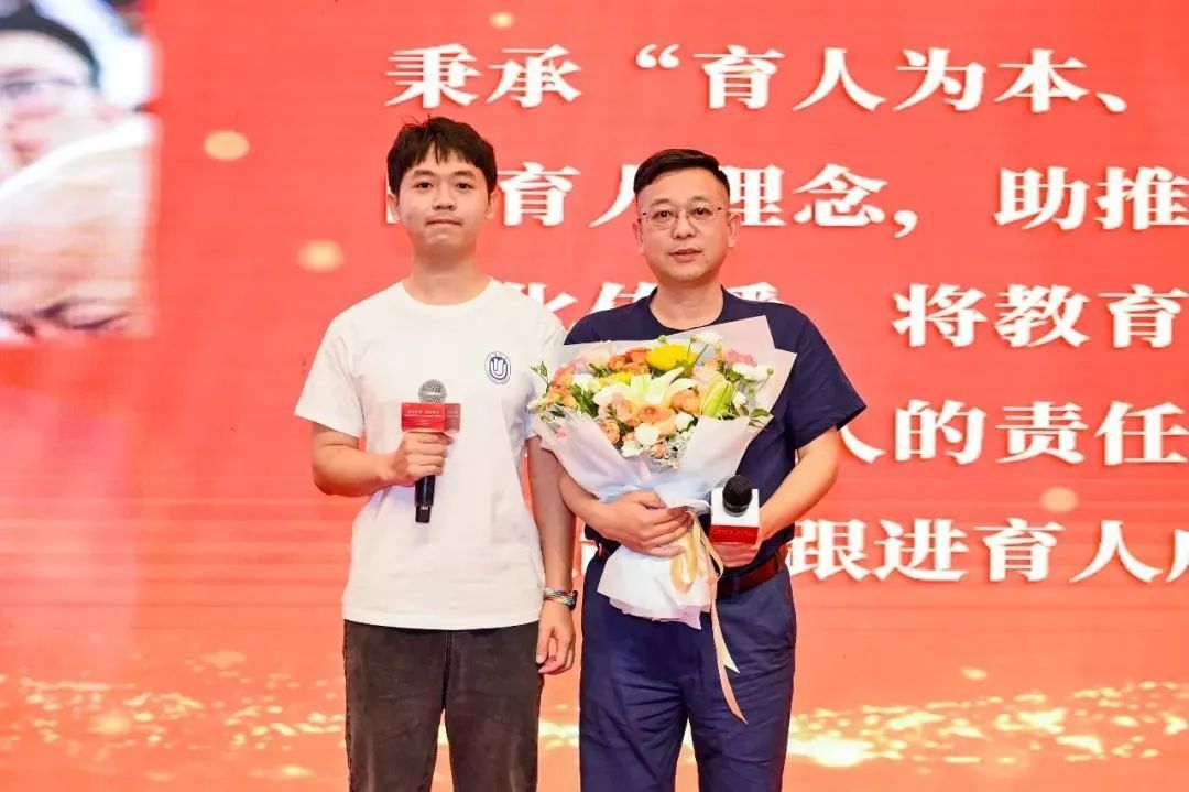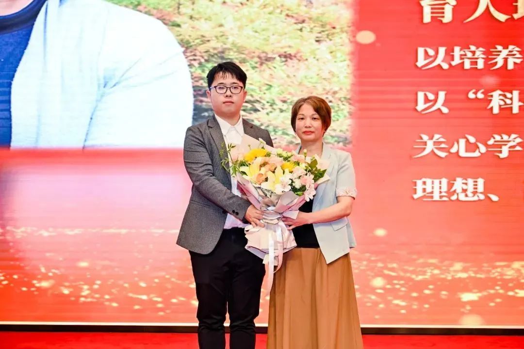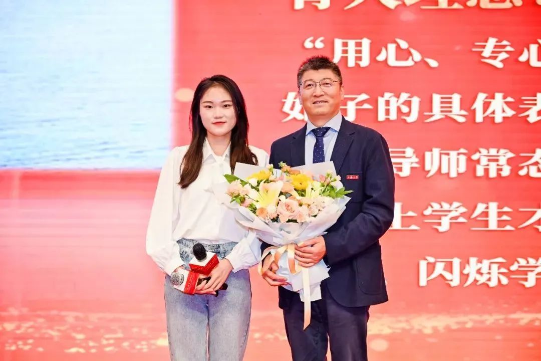 学高为师,身正为范,第八届“我心目中的好导师”宣传视频播放之后,颁奖典礼正式开启,10位“我心目中的好导师”获得者依次上台,从学生代表手中接过鲜花。