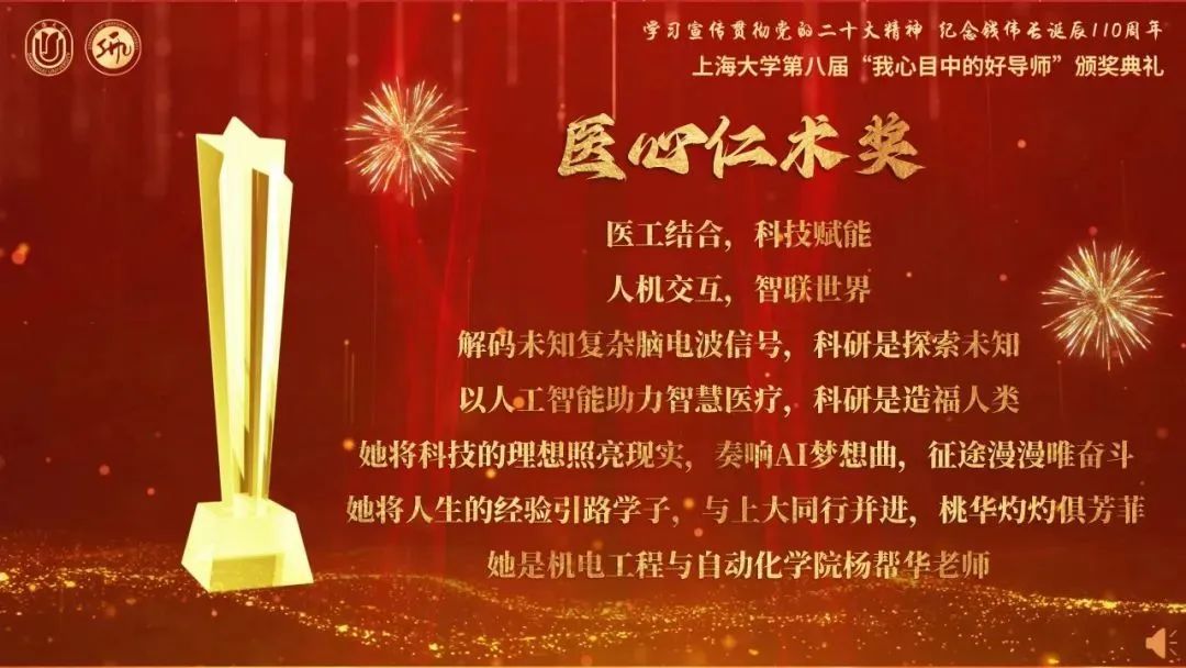 “医心仁术奖”获得者机电工程与自动化学院杨帮华教授以“科技服务于生命健康,让人们的生活更美好”为科研宗旨和育人理念,分享了其在教书育人的过程中激发学生对科研的兴趣,让科研服务社会,她指出:在教学中,不仅要通过实践磨砺个人素养,更要多多关心学生生活、关注学生成长,鼓励学生参加各类活动。同时,主动引领学生在实际中发现问题、解决问题,最终达到“科技服务于生命健康,让人们的生活更美好”的科研宗旨。