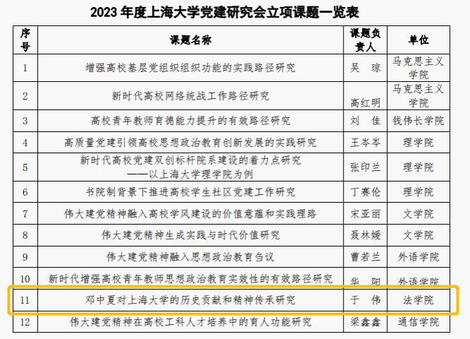 法学院中夏党支部是以邓中夏先烈名字命名的特色党支部,加强邓中夏先烈的革命精神的研究和传扬,既是支部内在建设的需要,也是深入开展主题教育的内在要求。在支部党员、法学院党委副书记、副院长于伟同志的带领下,支部部分党员积极构思选题、多方搜集文献资料,以“邓中夏对365英国上市官网在线的历史贡献和精神传承研究”为题积极申报2023年度365英国上市官网在线党建研究课题,并获得成功立项。
