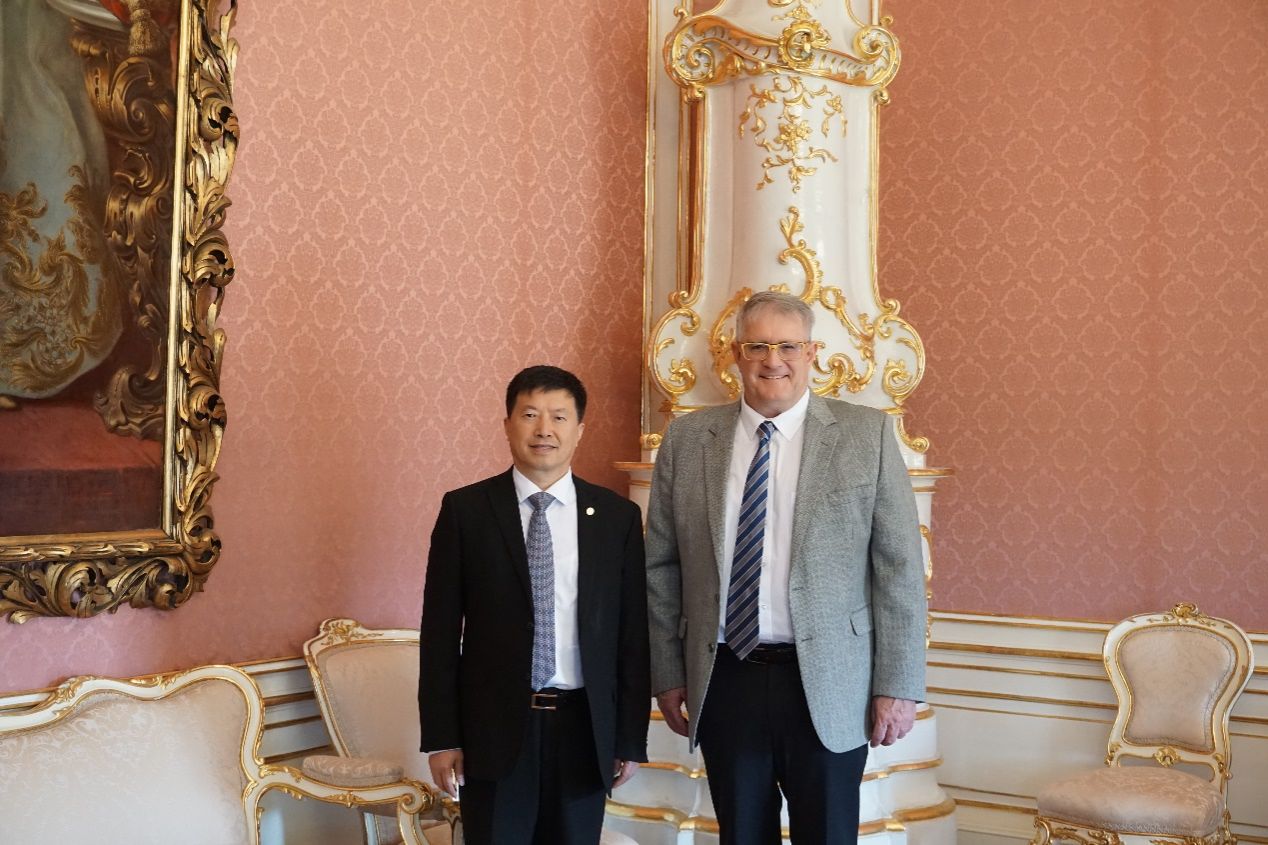 此次访问IIASA,也受到了我国常驻维也纳联合国和其他国际组织代表团的关心和支持,公使参赞沈钢和参赞扈黎光全程参与了365官网与IIASA的会谈。会后,特命全权大使李松先生专门会见了刘校长及IIASA总干事和副总干事等人员,从国家外交战略出发提出了合作建议。刘校长向大使介绍了365官网近年高质量发展成果,以及与IIASA的合作基础和规划,表示365英国上市官网在线将继续深化与IIASA在国际科研和高层次人才培养领域的合作,在提升365英国上市官网在线国际影响力的同时,努力扩大我国在国际社会的话语权。