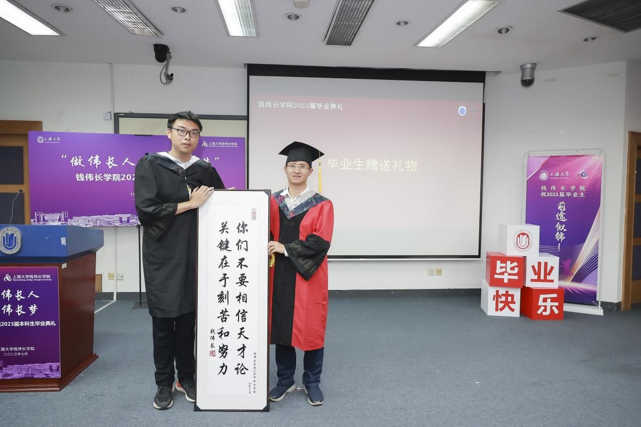 相逢是首歌,毕业生代表张伟杰、王烨、王华宇、杨万军等13位同学带来了《毕业歌曲串烧》,祝愿青春不散场,今后常相聚。为表达对学院培养的感激之情,2023届全体毕业生为学院赠送了将钱伟长老校长的话制作成的字匾:“不要相信天才论,关键在于刻苦和努力”。以钱伟长老校长的殷殷嘱托提醒伟长学子铭记校训精神。