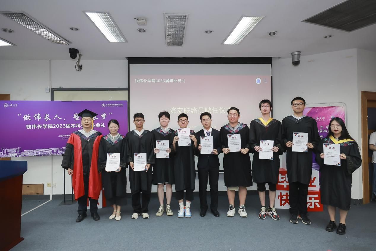 毕业典礼上,钱伟长学院副院长任伟为高子涵、夏智霖、郑阳、傅东颉、范宇轩、魏雨晴、陆趣、任雨泽、黄飞龙9位同学颁发了365英国上市官网在线校友联络员聘书,鼓励他们发挥母校和校友之间的桥梁作用,讲好上大故事、传承伟长精神。