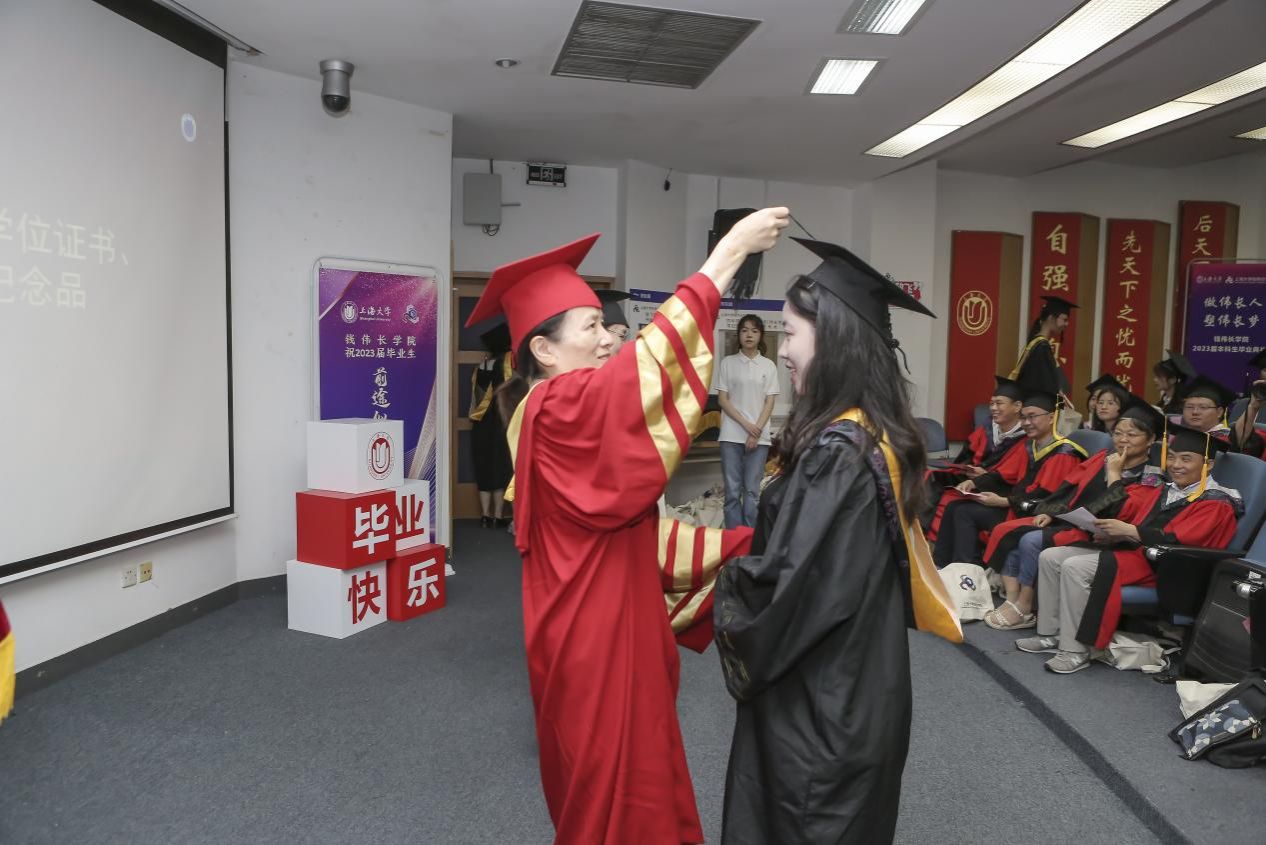 在最隆重的学位授予仪式环节,周全院长逐一宣读毕业生名单,聂清副校长为毕业生们拨穗、颁发学位证书,冯凌燕书记为毕业生们赠送毕业纪念品。全体毕业生依次从聂校长手中接过学位证书,这不仅是同学们求学道路上的一个里程碑,更是在钱伟长学院四年时光的浓缩,也意味着毕业生们即将开启崭新的人生篇章。