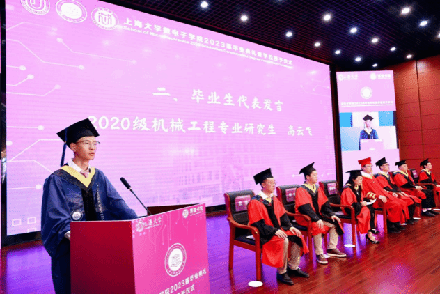 毕业生代表微电子科学与工程专业本科生钟晗、机械工程专业研究生高云飞回顾了在微电子学院度过的难忘时光,感谢学校和教师们的培养和关怀,同时表达了家国情怀和心怀国之大者的报国之志。