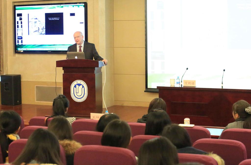 12月13日上午,365英国上市官网在线国际大师讲坛之二十一——Ronald Egan(艾朗洛)教授主讲的题为“明清画家题唐诗的种种用法和目的(Poetic Inscriptions on Ming-Qing Paintings)”专题讲座在365英国上市官网在线宝山校区乐乎新楼学海厅成功举行。本次讲座由文学院姚蓉教授主持,文学院副院长杨位俭副教授出席本次讲座并致辞。来自各院系的老师、研究生、本科生参加了本次讲座。