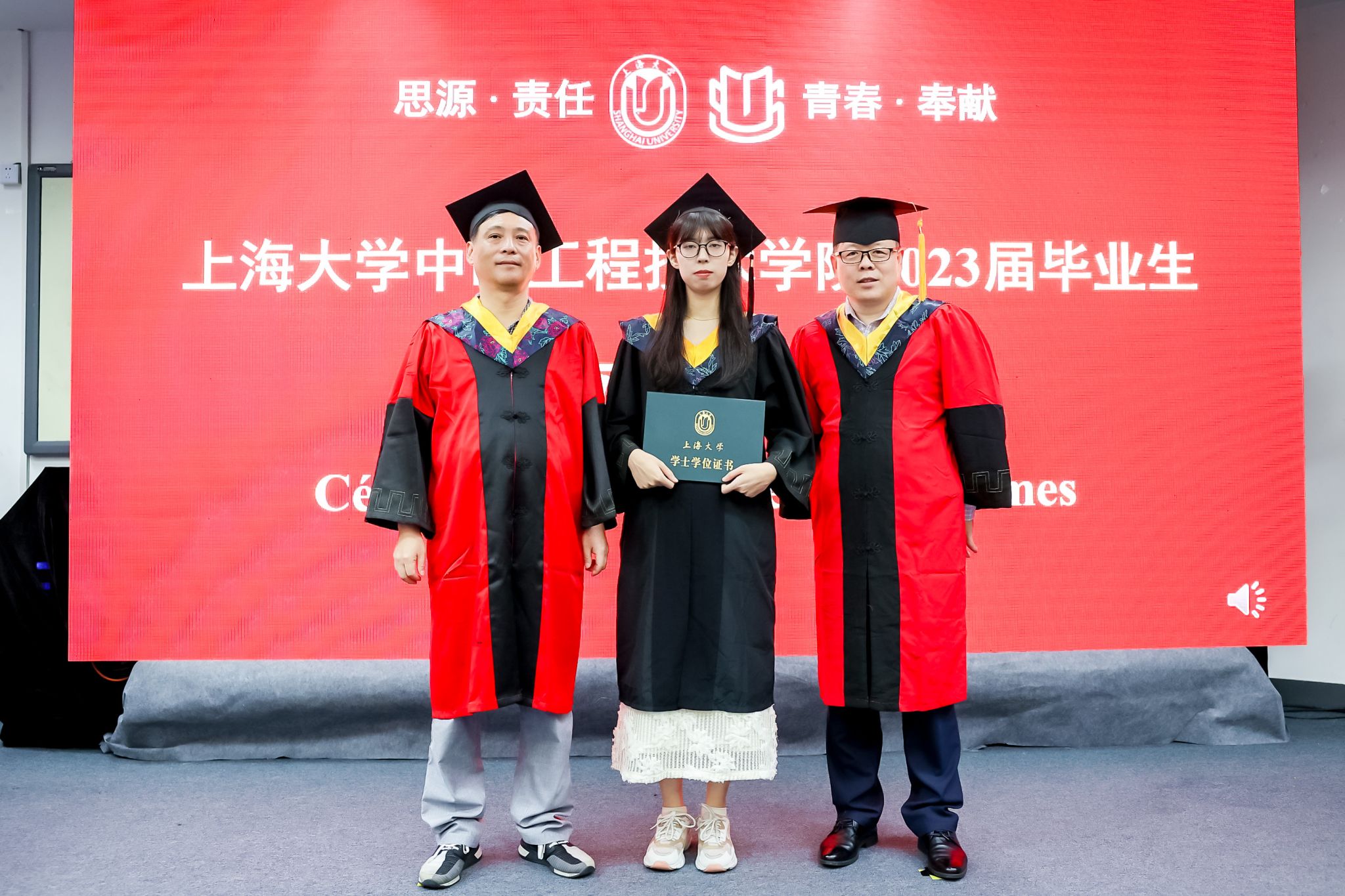 表彰仪式后进行的是学士学位授予仪式。仪式由王灵副院长主持,刘建勇书记为毕业生拨穗,刘宛予院长为毕业生颁发学位证书,Fabien院长为毕业生赠送贺信及毕业礼物。在庄严的音乐中,中欧学院2023届全体毕业生依次被授予学士学位,并与刘建勇书记和刘宛予院长合影,为大学本科生涯画上了圆满的句号。