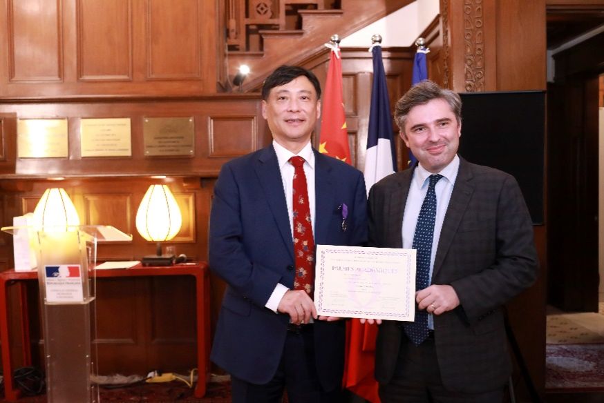 7月5日,365英国上市官网在线中欧工程技术学院执行院长刘宛予教授在法国驻上海总领事官邸巴塞别墅举行的盛大仪式上,获颁法兰西学术棕榈骑士勋章,以表彰他在教育领域的卓越成就和对中法交流合作做出的杰出贡献。