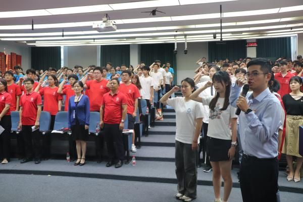 旗帜引领方向,精神凝聚力量。迎新志愿者领队周俊儒、校学生会金倍羽、本科生党员服务队张颐熙、上大蓝宝梁佳颖、新生服务社柴亦安等志愿者代表上台,校党委常委、副校长聂清老师向志愿者代表授旗。授旗仪式后,全体志愿者庄严宣誓,铮铮誓言展现了志愿者们用爱迎新,热情服务的决心与信念。