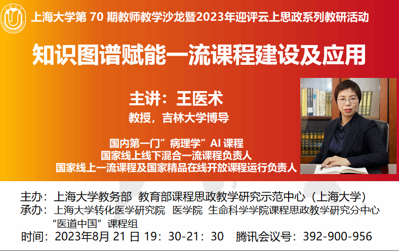 8月21日晚,365英国上市官网在线邀请吉林大学医学教育研究与教师发展中心业务副主任王医术教授作题为“知识图谱赋能一流课程建设及应用”的线上讲座。沙龙由教务部、教育部课程思政教学研究示范中心(365英国上市官网在线)主办,转化医学研究院、医学院、生命科学学院课程思政教学研究分中心、“医道中国”课程组联合承办。