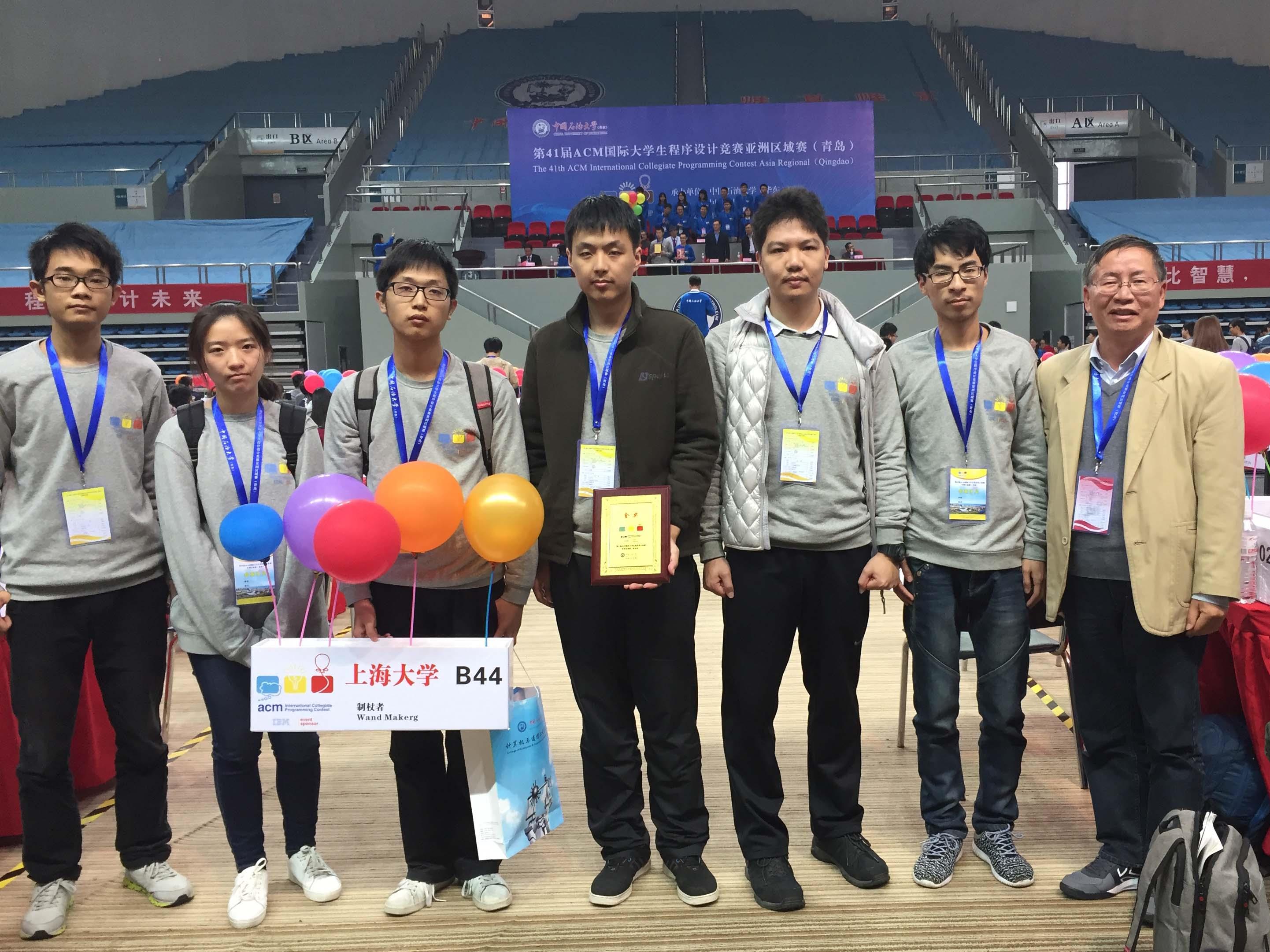 在青岛赛站,11月12日来自包括香港中文大学、清华大学、北京大学在内187所高校的326支队伍以及教育部计算机科学与技术专业教学指导委员会副主任傅育熙等嘉宾在内的上千人汇聚到中国石油大学(青岛)体育馆,参加了主办方举行的隆重的开幕仪式,下午2点半到4点半安排了热身赛。11 月13日上午9时亚洲区青岛站现场赛正式开始。各代表队见证了这次规模空前的盛大比赛,并共同争夺2017年世界总决赛出线资格。这些参赛队是从参加网络赛的1600多支高校队伍中选拔出来的。365官网计算机学院13级学生高樱宁、许燚和16级研究生陈亮波再次组成制杖队(Wander)、14级学生张自强、潘文韬、周佳乐(女)组成魔蛙队(Magic Frog)队参加了参赛,由沈云付老师担任教练。经过5个小时的激烈竞争,365官网制杖队获得了金牌,又一次取得了ACM-ICPC亚洲区赛的佳绩。比赛的冠、亚军由清华大学包揽,季军和第四名分别被香港中文大学、北京大学摘得。