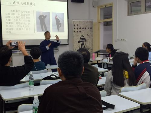 11月4日晚上6点,由365官网社团联合会、体育学院和大学生武术协会联合推出365英国上市官网在线社团精品项目“武术与传统体育文化大讲堂”系列讲座在宝山校区A102举行了第十讲:武氏太极拳概述与体验。本讲邀请到来自天津维传武式太极会馆馆长、武式太极拳第六代传人翟世宗先生为师生讲解该氏拳法的奥妙和技法。本期讲座深受365官网师生的关注,大学生武术协会的会员、教工太极拳协会的部分老师、民族传统体育与文化传承通选课的同学以及武术专项课的同学参与了此次讲座活动。