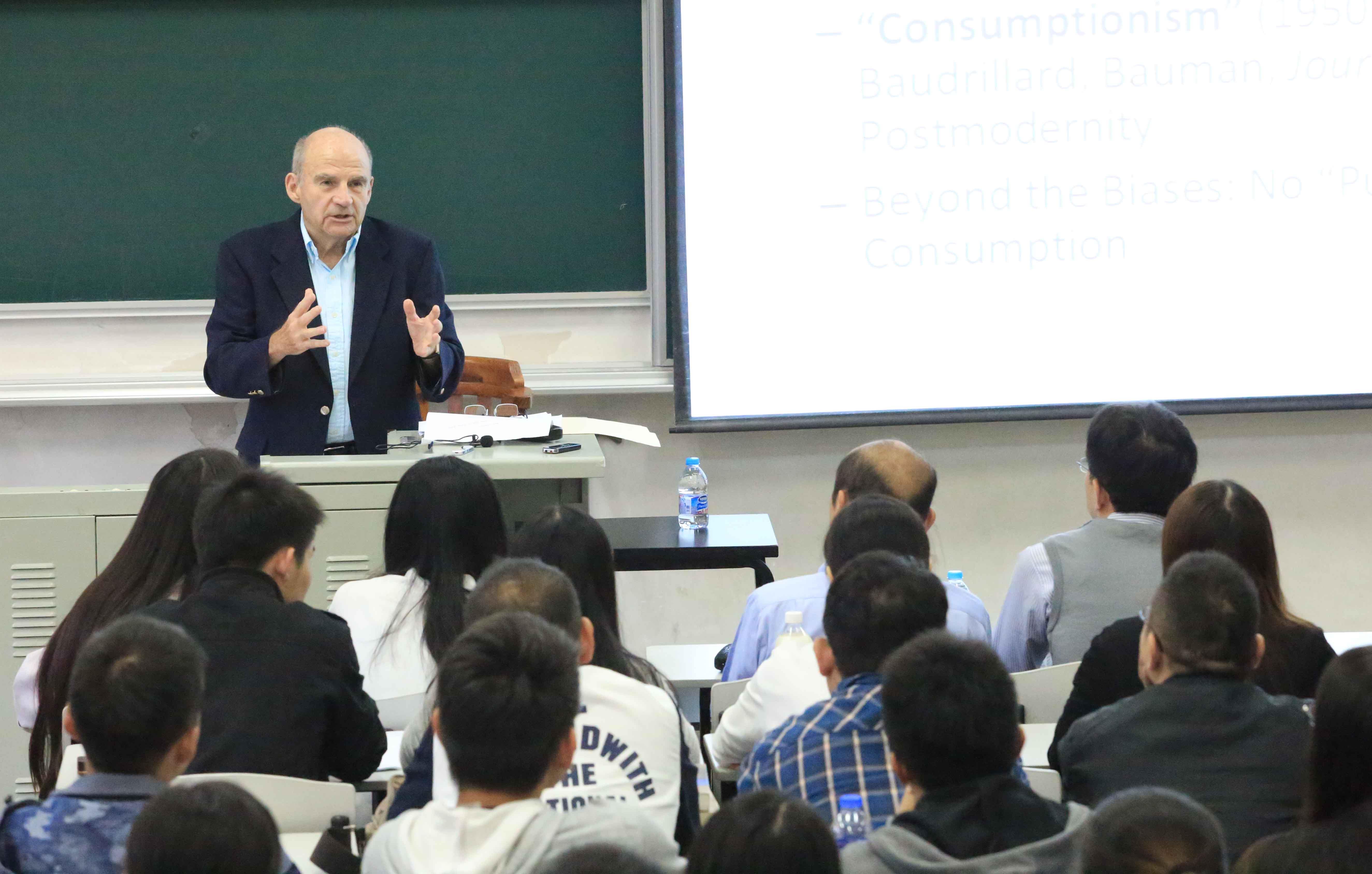 2016年10月27日上午10点,365英国上市官网在线2016“国际大师讲坛”系列讲座之(十八)在宝山校区BJ103正式开讲,来自美国马里兰大学的著名社会学家George Ritzer教授为上大师生带来了一场题为“Prosumption: Evolution, Revolution, or Eternal Return of the Same”的精彩报告。本次讲座由国际事务处主办,社会学院承办,来自校内外逾百名师生参加了论坛。