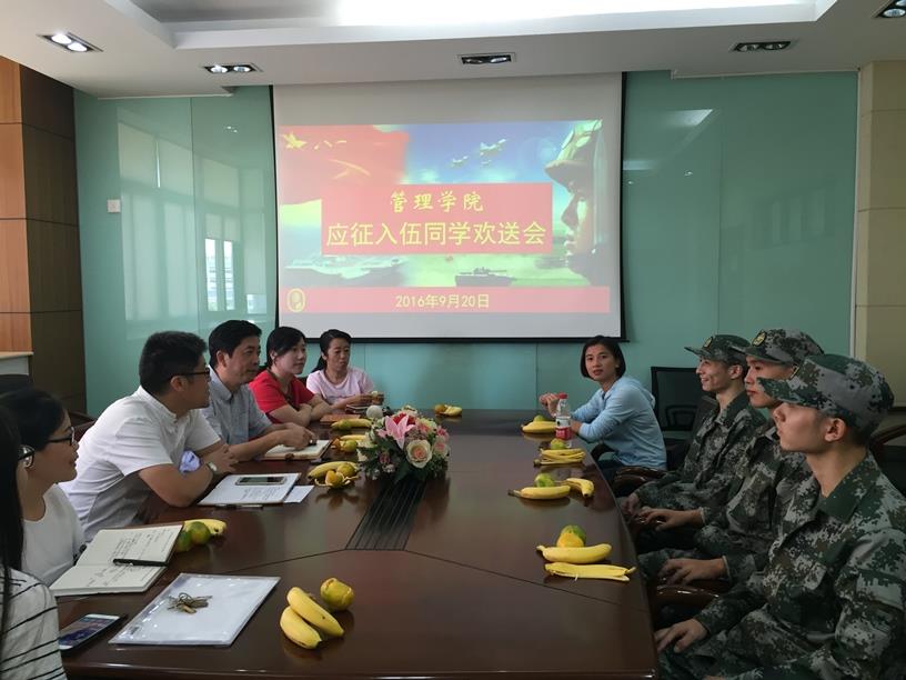 9月20日下午,管理学院在学院467会议室举行了简朴而隆重的2016年应征入伍同学欢送会。今年管理学院共有4名同学应征入伍,分别是12级的戴子苗、13级的赵国雄、14级的涂竞元和15级的史自丙同学。管理学院党委书记李伟、团委书记李勤以及四名新兵同学的辅导员参加了欢送会。欢送会由党委副书记朱宏涛老师主持。