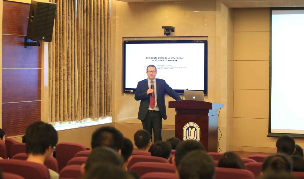 Coates教授首先介绍了美国著名常青藤大学----康奈尔大学的一些基本概况,接着通过问答的方式让学生更加深入地了解康奈尔大学本科生和研究生的学习与生活情况,比较了中美两国学生特别是化学学科本科生的学习和生活情况,将申请康奈尔大学研究生的技巧倾囊相授。他认为成功的研究生应该具备高效工作、学会自己解决问题的能力,与同学保持良好的关系等也是成功实现研究生学习的关键因素。他也认为研究生在加入课题组或选择导师之前应该尽多地了解各方面的信息,以判断该课题组的氛围和习惯是否适合自己。