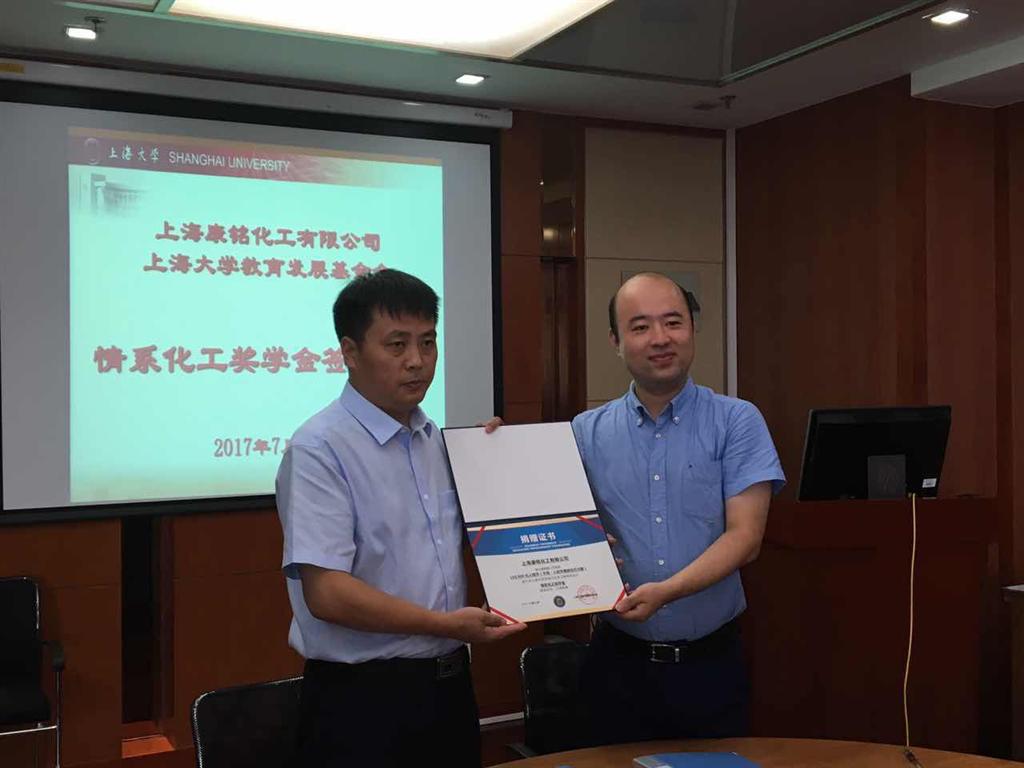 最后,学校对外联络处副处长、校友会办公室副主任曹俊发言。他对康铭化工公司在自身取得快速发展的同时,积极回馈社会、支持高等教育发展的做法表示由衷钦佩和感谢,希望此次奖学金的设立和产学研合作,使同学们有更多的机会接触社会、接触实际,在实践中培养能力,增强自身社会责任感。另一方面整合资源、通力协作,各自发挥优势,在产学研合作方面迈上新的台阶。另外他表示,上大校友会一直以来十分关注校友企业的发展,希望通过多种途径了解校友需求、拓展合作领域,切实发挥校友会的桥梁纽带作用。