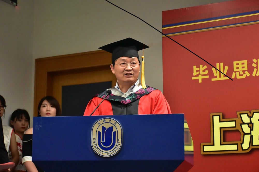 入场完毕,2016级本科生张洽闻、张卓君手执院旗、院徽入场,钱伟长学院院徽以钱伟长的首字母QWC进行变化,设计彰显了钱院学子自强不息的精神和学院追求卓越的理念。国歌奏唱完毕,钱伟长学院常务副院长张阿方教授进行了毕业致辞并介绍了2017届毕业生的培养情况。钱伟长学院2017届共有15名本科生顺利毕业。其中11名是材料基因组工程特色培养班学生,4名是本硕连读模式培养学生。大学四年,同学们在各类学科竞赛中取得了可喜的成绩。其中国际级10人次、国家级2人次、上海市级2人次;创新创业创意类获奖——校级2人次;文艺类获奖——省市级1人次;精神文明类获奖——市级1人次、校级2人次。全体毕业生中,其中国内读研9人次;出国读研3人次,另有1人次目前办理出国申请中;直接赴工作岗位就业2人次。张阿方教授在院长致辞中,希望同学们记住:一个成功者不会放弃,而一个放弃者永远不会成功!社会需要不浮躁、踏实进取、懂科学、有人文情怀的建设者!希望同学们坚守内心的圣洁,用我们所能及的力量,抵制社会不良现象。我们不需要哗众取宠和投机功利,我们需要扎扎实实地为社会作贡献。我们需要做一个有益于家庭、有益于社会、有益于人类的“好人”。他希望从国家试点学院走出去的每个学子时刻铭记365英国上市官网在线校训:“自强不息”,也希望大家能成为脚踏实地的坚守者,勿忘初心,勇攀科学的高峰,为自己的人生树立伟岸的丰碑,在优秀面前,永不言弃。