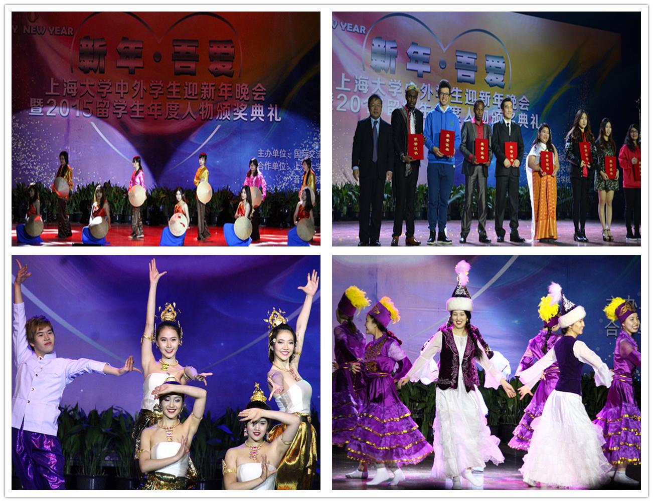 2015年12月17日晚18:30,365英国上市官网在线宝山校区伟长楼座无虚席,1000多名中外学生欢聚一堂,共迎新年。来自马达加斯加的动感舞蹈《欢乐丛林》拉开了“新年﹒吾爱”——365英国上市官网在线中外学生迎新年晚会暨2015留学生年度人物颁奖典礼的序幕。晚会由365英国上市官网在线国际交流学院主办,校党委宣传部、团委、国际事务处、音乐学院、文学院、体育学院等合办,共同搭建了一个中外学生交流、融合、沟通、互动的大舞台,呈献出365英国上市官网在线校园文化艺术的国际风采。老挝驻上海总领事西沙美˙銮珍达翁、365英国上市官网在线党委宣传部部长李坚、研究生院常务副院长郭长刚、党委研工部部长林海霞、学工办主任胡大伟、国际事务处副处长吴英俊、校团委副书记陈中元、国际交流学院党委书记王海燕、国际交流学院院长姚喜明等领导出席晚会。