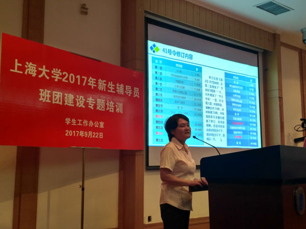 学工办副主任吴蔚老师围绕新版学生手册修订说明进行政策解读。2017年2月教育部发布第41号令,学生工作办公室与学校19个相关部门经过近半年的协商,终于在9月完成新版学生手册的修改工作。吴老师从修订背景、高校学生管理面临的新形势新要求、修订宗旨、修订内容、修订特点、修订思路、修订过程、修订框架、修订清单、案例解析和辅导员工作提升等方面全面展开解读。她希望各学院新生辅导员要加紧贯彻落实《规定》要求,进一步转变管理理念,处理好管理与服务的关系,将管理与育人相结合,不断提高管理和服务水平。