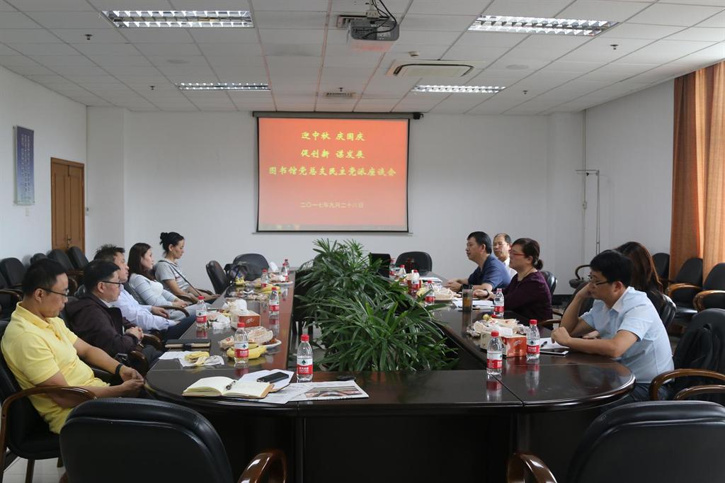 为了进一步贯彻落实学校统战工作精神与服务学校高水平大学建设战略,图书馆直属党总支于9月28日下午在校本部图书馆三楼会议室召开主题为“迎中秋、庆国庆、促创新、谋发展”的民主党派座谈会,来自图书馆的民革、民建、九三、民盟等6位民主党派同志参加了会议,党总支委员、常务副馆长陆铭,总支委员、副馆长卢志国,党总支委员倪代川,分工会主席叶春波等出席会议,总支书记王远弟主持会议。