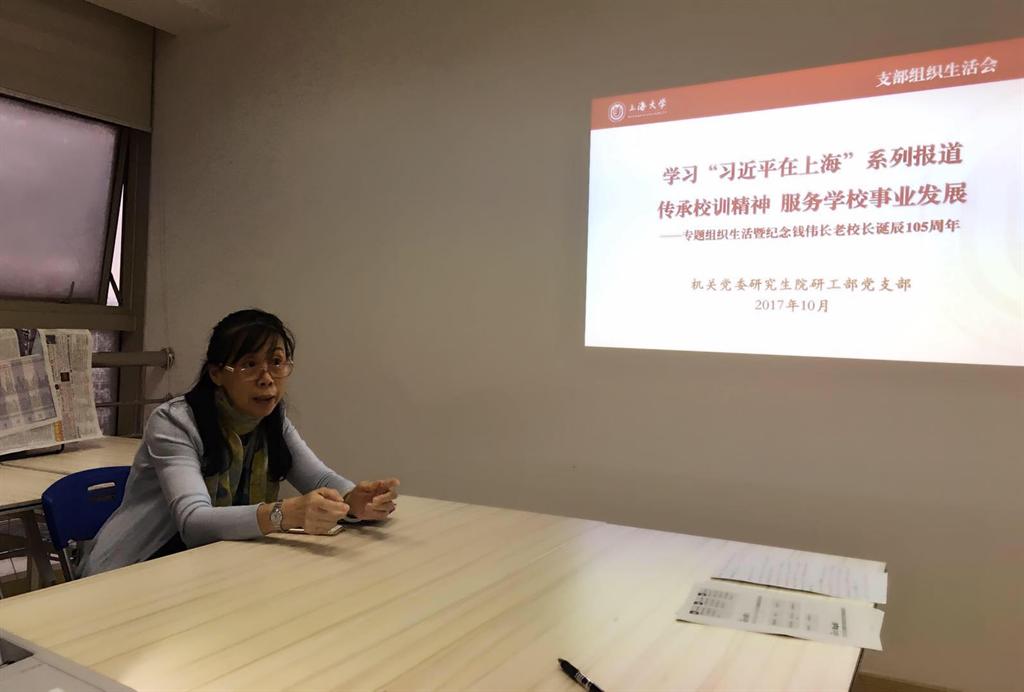 首先,支部书记魏宏作《学习“习近平在上海”系列报道,传承校训精神,服务学校事业发展》的专题报告。她首先带领大家回顾了“上海是党的诞生地,要牢记历史使命”、“开明睿智才能进一步海纳百川”、“真正的政绩在老百姓的口碑里”这三个方面系列报道的内涵要义。并带领大家一起观看了央视拍摄制作的《钱伟长强国之梦》中的三段小视频,重温了老校长一切从国家的需要出发的大格局、从71岁到98岁由上海工业大学到365英国上市官网在线的大胆办学实践以及在毕业典礼上对校训内涵的动情诠释。她提出,研究生院、研工部党支部,作为学校研究生培养的管理部门、服务窗口,要牢记高校办学使命,学习总书记的讲话精神,对接学校高水平大学建设的新任务新要求,要聚焦研究生培养的根本任务,坚持“问题导向、需求导向、发展导向”,主动担当,及时发现和关注研究生培养管理过程中碰到的新情况、新问题;架构起研究生院和研工部之间的日常沟通桥梁,更多关注师生的需求,鼓舞人、激发人,要让支部工作更好地服务于推动学校人才培养工作,推动校训使命愿景的有效落地,服务于学校的事业发展、上海的城市发展、社会建设乃至国家战略的实施推进。