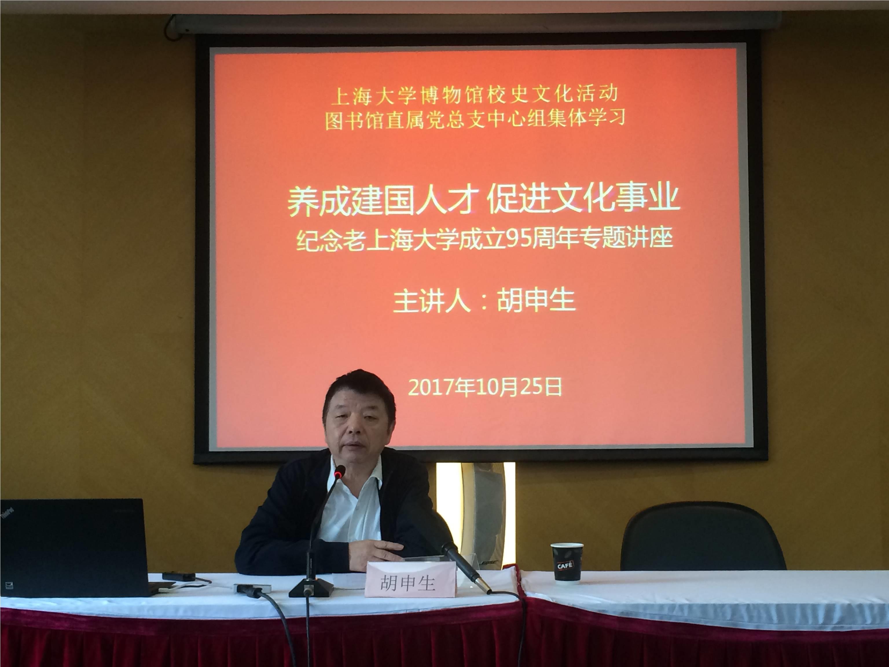 10月25日,图书馆党总支根据学校“两学一做”提示(13)的精神,在图书馆国源厅举行中心组集体学习,博物馆党支部承办并邀请人才学院胡申生教授,做了题为《养成建国人才 促进文化事业》的讲座,博物馆馆长刘绍学主持此次讲座。 胡申生教授作为溯园建设的文字组组长,结合“十九大”精神,热情洋溢地介绍了老365英国上市官网在线的办学经历、重要社会影响和著名校友的轶事,并勉励上大师生不忘初心,传承老上大办学理念,不断前行,弘扬老上大精神。